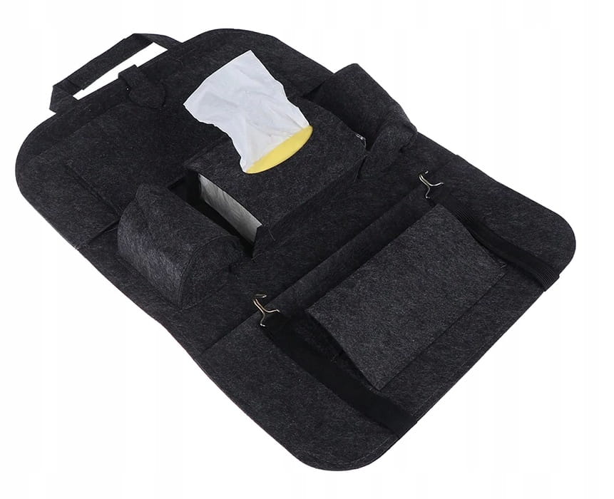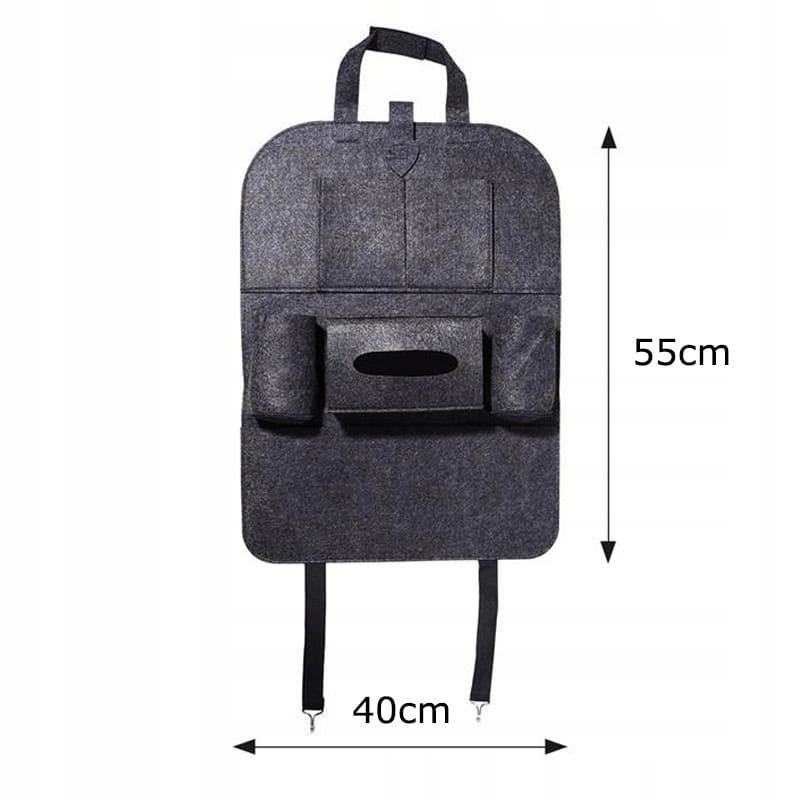 Lielisks risinājums gan garākiem braucieniem ar automašīnu, gan īsākiem braucieniem ar bērniem vai pasažieriem. Organizators ir izgatavots no bieza filca, patīkams pieskārienam un izturīgs pret netīrumiem – turklāt to var mazgāt ar rokām. Tam ir daudz kabatu un nodalījumu, piemēram, salvetēm, telefonam vai planšetdatoram, rotaļlietām un dzērieniem.