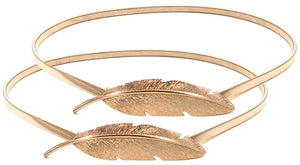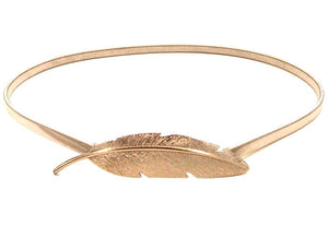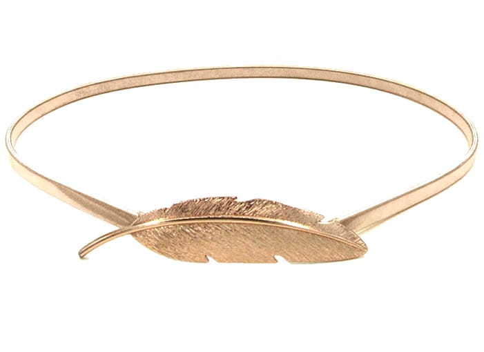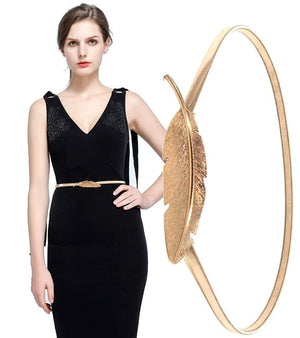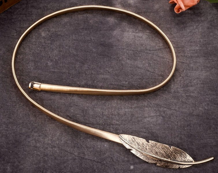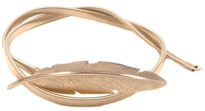 Šī elegantā zelta josta ar atsperes mehānismu un dekoratīvu lapiņu ir lielisks aksesuārs, kas piešķirs jūsu tērpam izsmalcinātību.