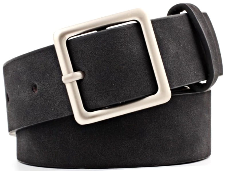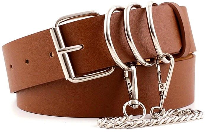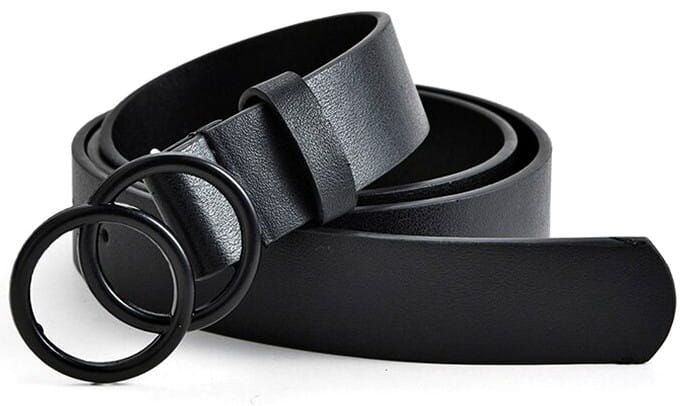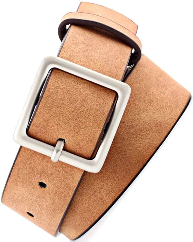 Lai uzsvērtu vidukli Plata josta ar stilīgu sprādzi 4–5 cm plats, var dekorēt ar kniedēm, pērlēm vai ķēdīti; regulējams garums