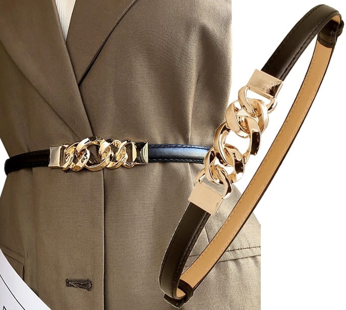• Plānas jostas: elegantas 2–2,5 cm platas jostas ar smalkām metāla sprādzēm, piemērotas kleitām, blūzēm vai svārkiem.