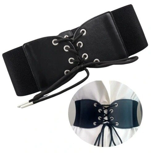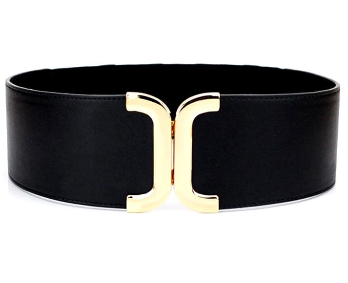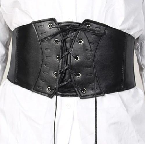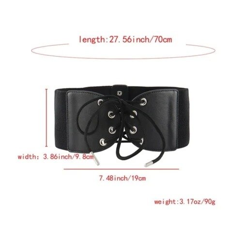 Lai uzsvērtu vidukli Plata josta ar stilīgu sprādzi 4–5 cm plats, var dekorēt ar kniedēm, pērlēm vai ķēdīti; regulējams garums