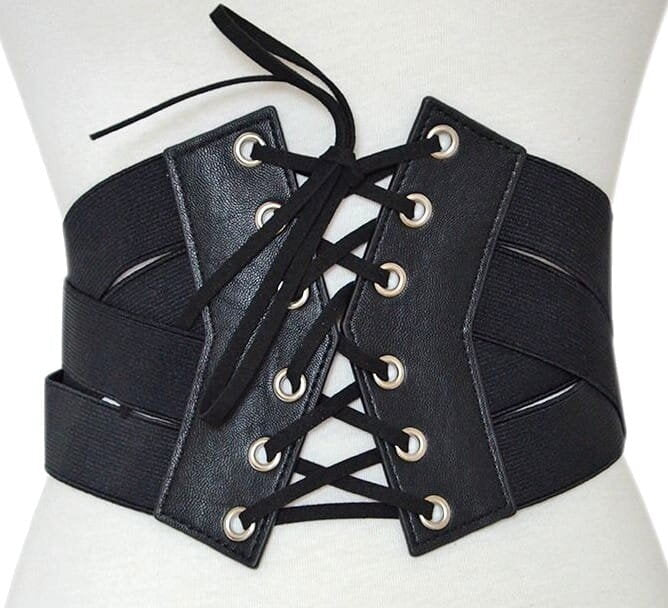 Lai uzsvērtu vidukli Plata josta ar stilīgu sprādzi 4–5 cm plats, var dekorēt ar kniedēm, pērlēm vai ķēdīti; regulējams garums