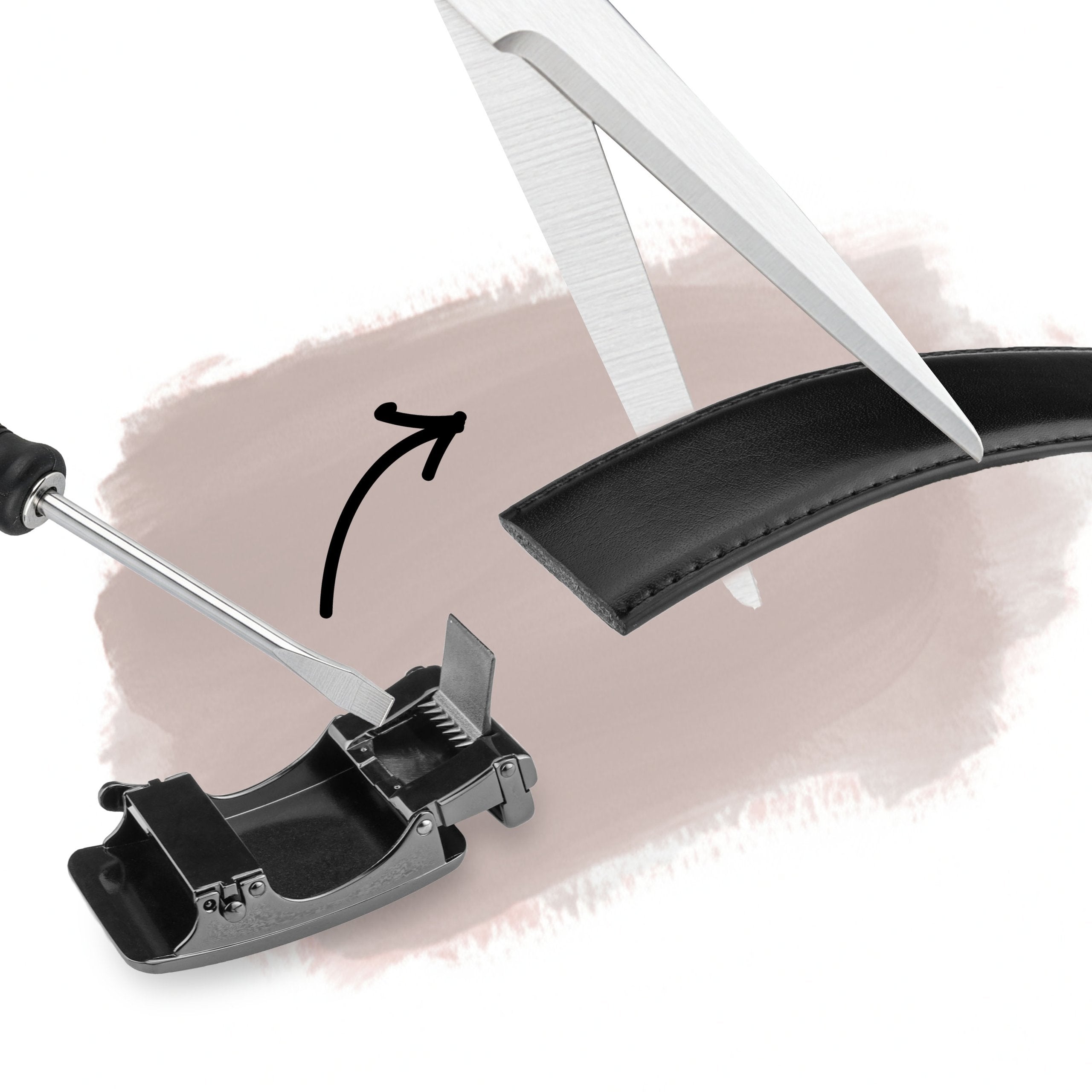 Atveriet sprādzi (paceliet fiksatoru aizmugurē), saīsiniet ādu līdz vajadzīgajam garumam un atkal nostipriniet sprādzi.