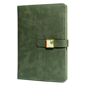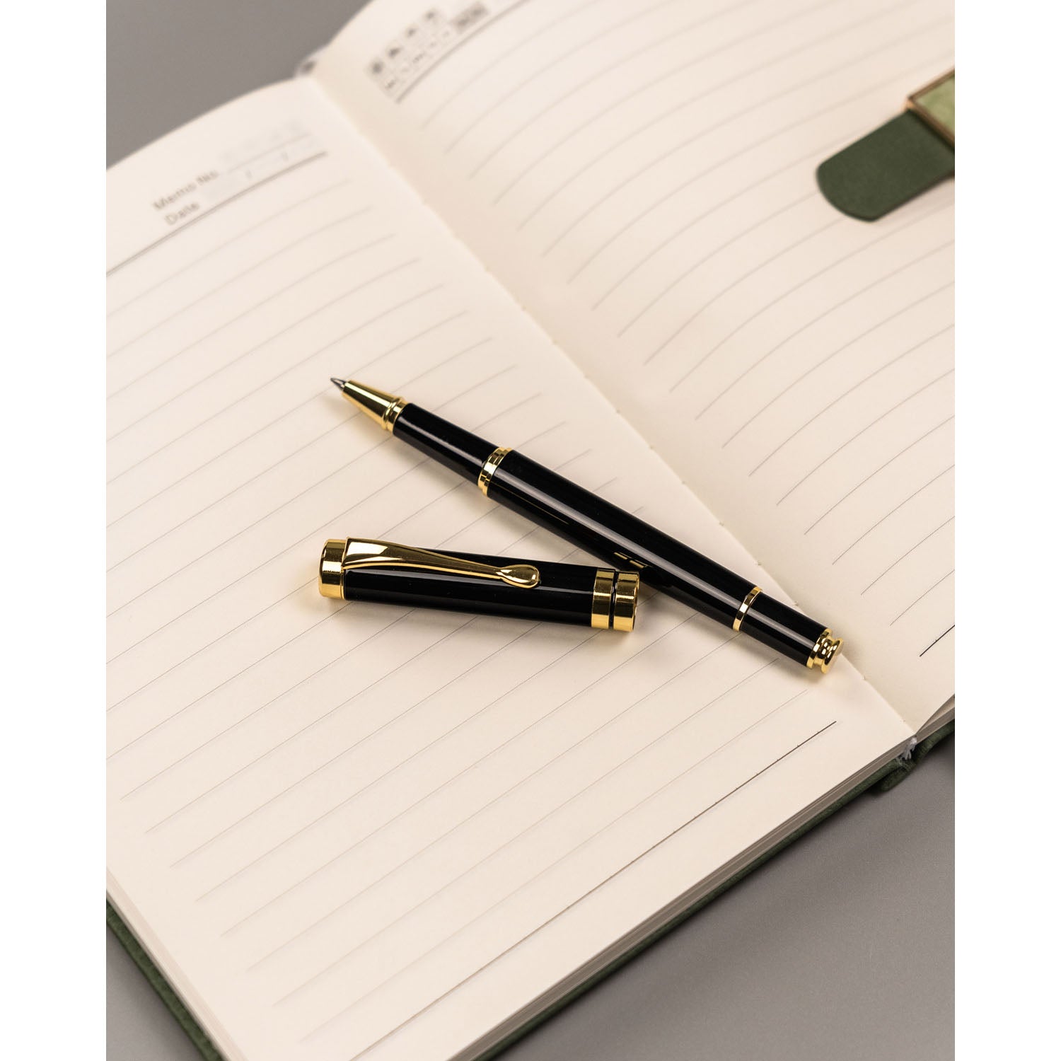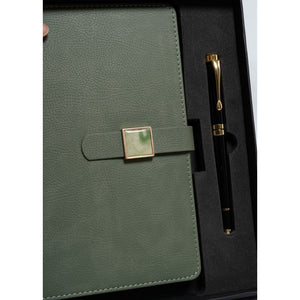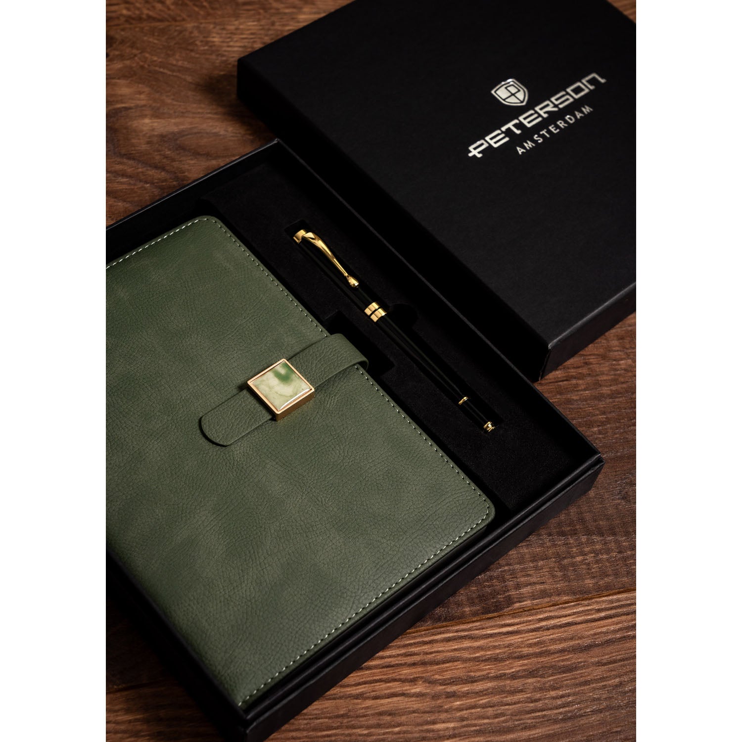 Šis elegantais dāvanu komplekts ir lieliski piemērots biznesa vai pilsētas stila cienītājiem. Tajā ietilpst zaļa piezīmju grāmatiņa ar ērtu magnētisko aizdari un melna pildspalva, kas nodrošina vienmērīgu rakstīšanu.