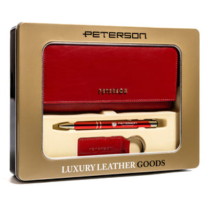 Šajā elegantajā dāvanu komplektā ietilpst liels sieviešu maks ar rāvējslēdzēju, ādas atslēgu piekariņš un sarkana pildspalva. Maks un atslēgu piekariņš ir izgatavoti no augstas kvalitātes īstas ādas, nodrošinot izturību un uzticamību.