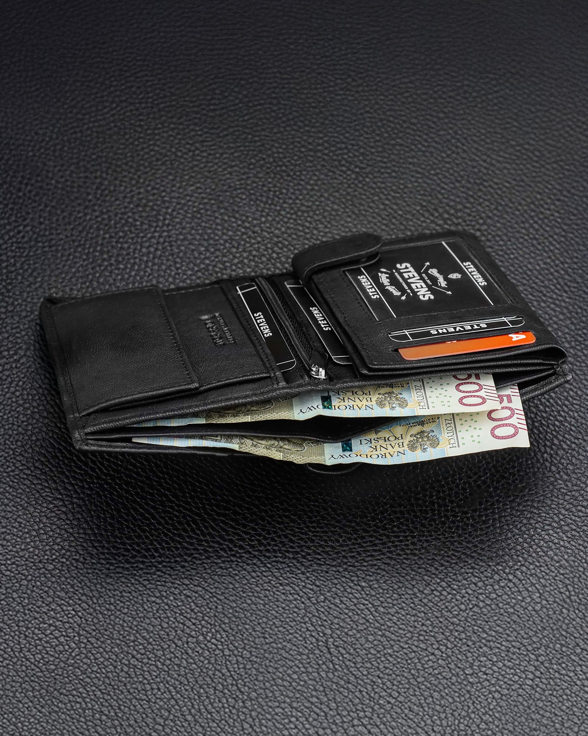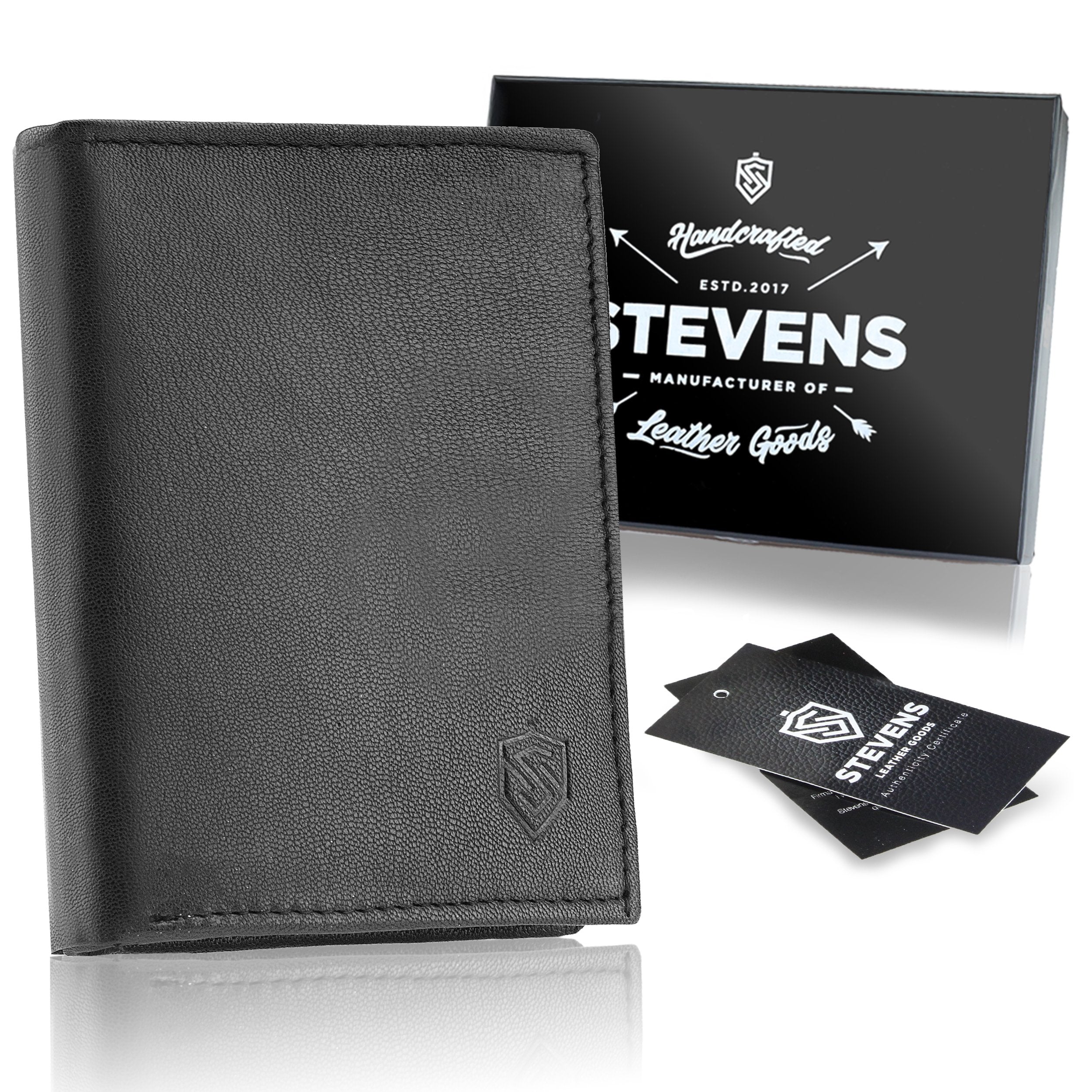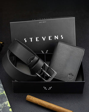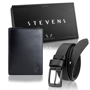 Elegants STEVENS® komplekts dāvanu kastītē. Klasiska dabīgās ādas maka un dabīgās ādas jostas kombinācija – praktiska, izturīga un piemērota jebkuram gadījumam.