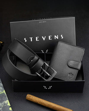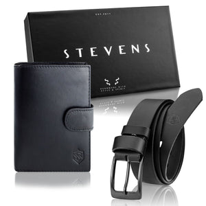 Elegants STEVENS® komplekts dāvanu kastītē. Dabīgās ādas maks un josta – klasika, kas piestāv jebkuram gadījumam.