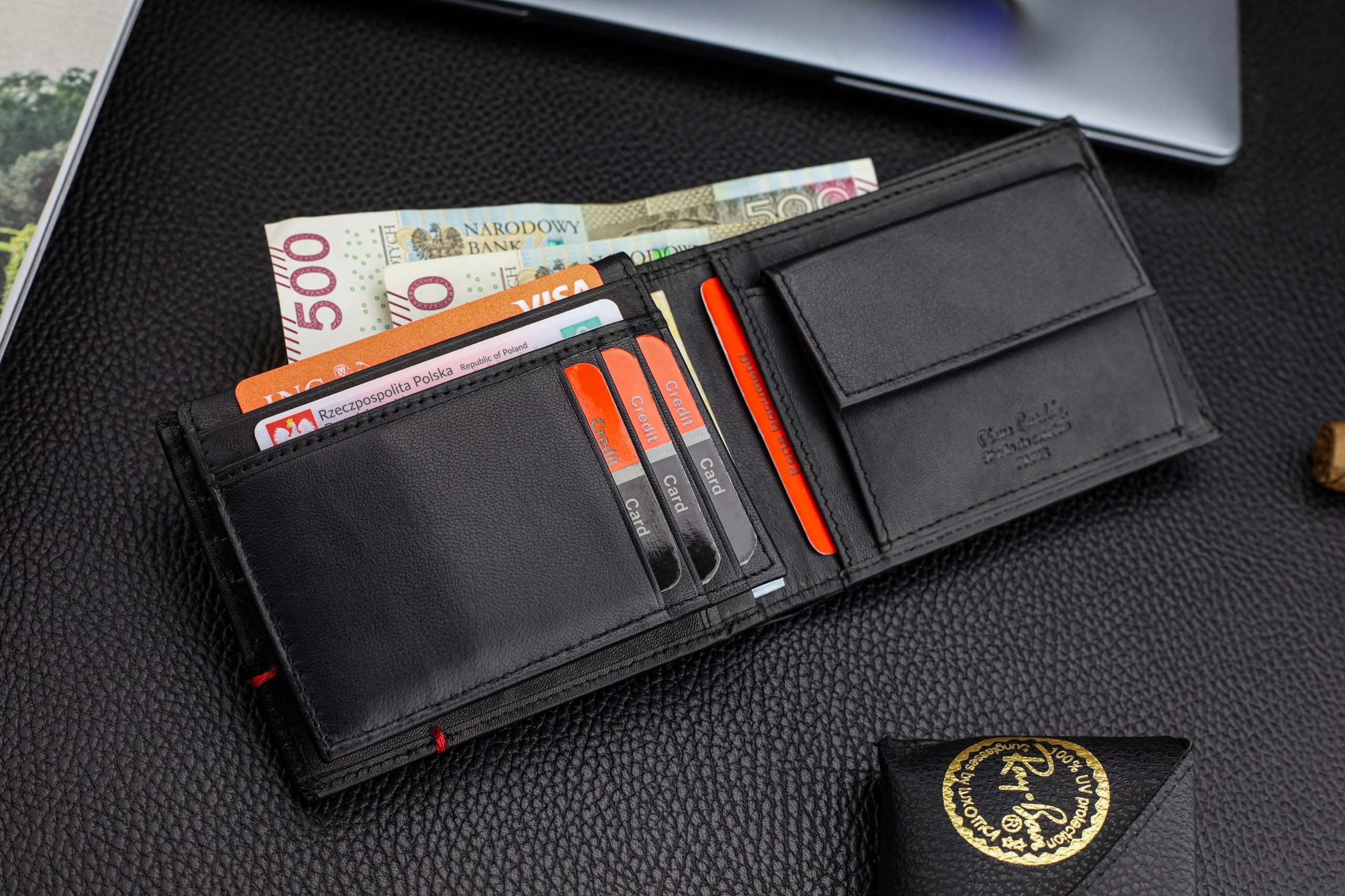 - Banknotēm: 2 ietilpīgi nodalījumi — ērti ievietojamas visas PLN un EUR banknotes.