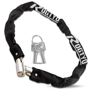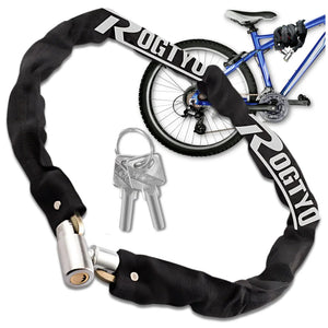 Ķēdes velosipēda slēdzene, garums 110 cm. Pastiprināta standarta versija. Svars: 920 g. Krāsa: melna. Materiāls: metāla sakausējuma slēdzene ar krāsotu/pārklātu aizsardzību.