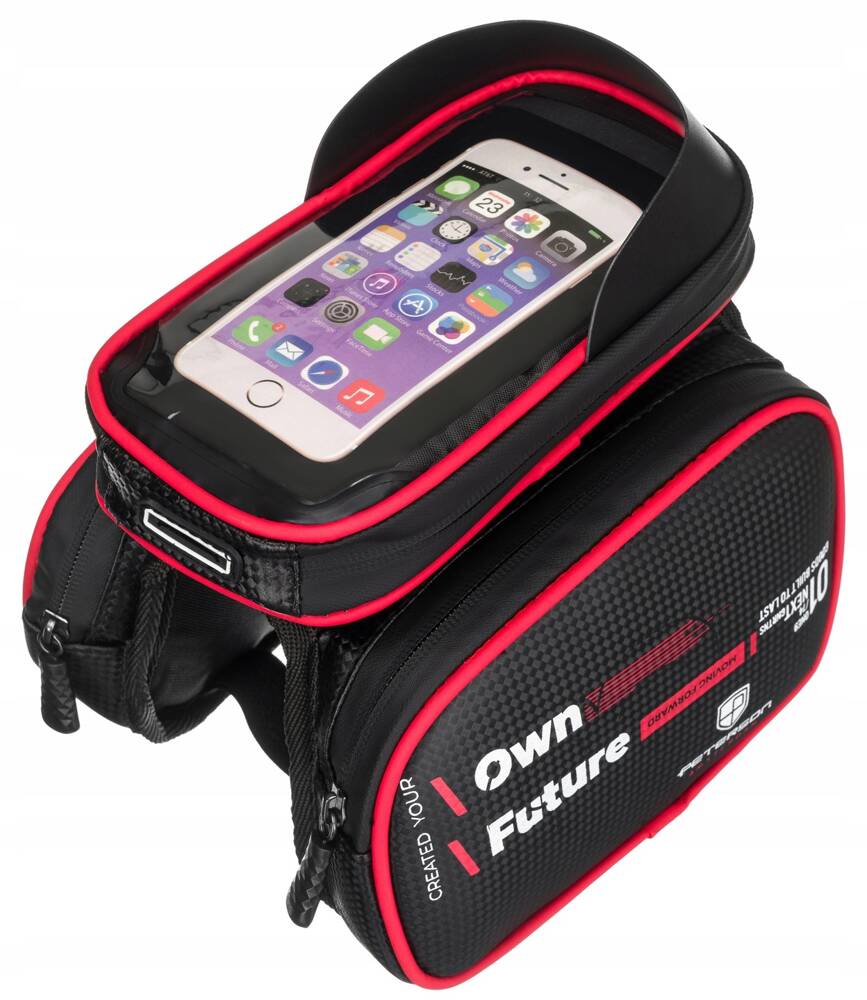 - Caurspīdīgs tālruņa nodalījums: Somai ir īpaša caurspīdīga kabata viedtālrunim ar diagonāli līdz 7 collām. Tas ļauj izmantot visas tālruņa funkcijas, braucot ar velosipēdu.