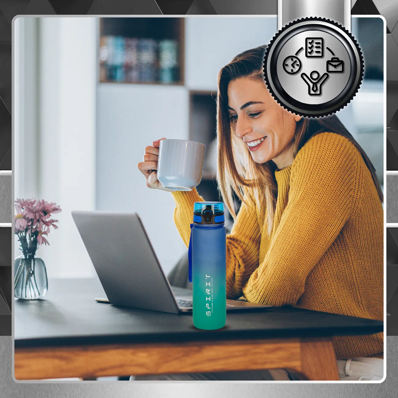 - Motivējošas piezīmes un laika zīmogi, kas mudina jūs dzert pietiekami daudz šķidruma visas dienas garumā