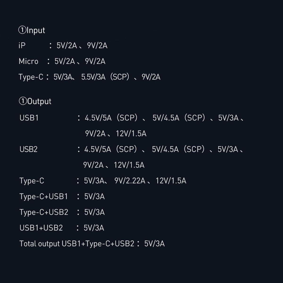 - USB-C: 5 V/3 A, 5,5 V/3 A (SCP), 9 V/2 A