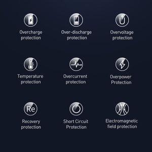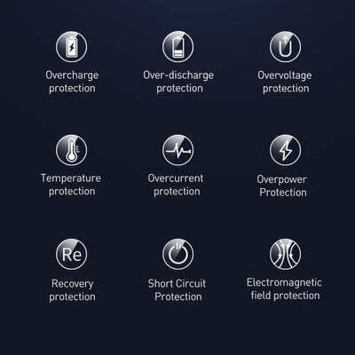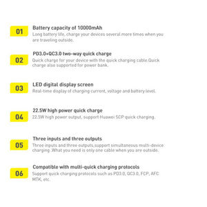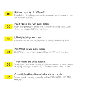 Baseus ārējais akumulators atbalsta vairākus ātrās uzlādes standartus, tostarp SCP, Quick Charge 3.0 un Power Delivery 3.0. Tam ir iebūvēti 2 USB-A izejas porti, USB-C ieejas/izejas ports, kā arī Lightning un Micro-USB ieejas porti. Produkts atbalsta maksimālo izejas strāvu līdz 22,5 W. Korpusa LED displejs rāda pašreizējo darbības vērtību un akumulatora uzlādes līmeni. Integrētā mikroshēma atbalsta vairākus aizsardzības veidus, lai aizsargātu pievienotās ierīces no bojājumiem.