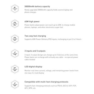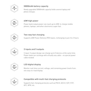 Pat 30 000 mAh ir pietiekami daudz jaudas, lai atbalstītu daudzas ierīces. Piemēram, iPhone 8 var uzlādēt aptuveni 12 reizes, iPhone XR — aptuveni 8 reizes, bet Xiaomi Mix 3 — aptuveni 6 pilnas uzlādes reizes. Ar tik ietilpīgu glābšanas vesti nebūs jāuztraucas par to, ka paliksit bez tālruņa vairāku dienu mūzikas festivāla vai kempinga piedzīvojuma laikā.