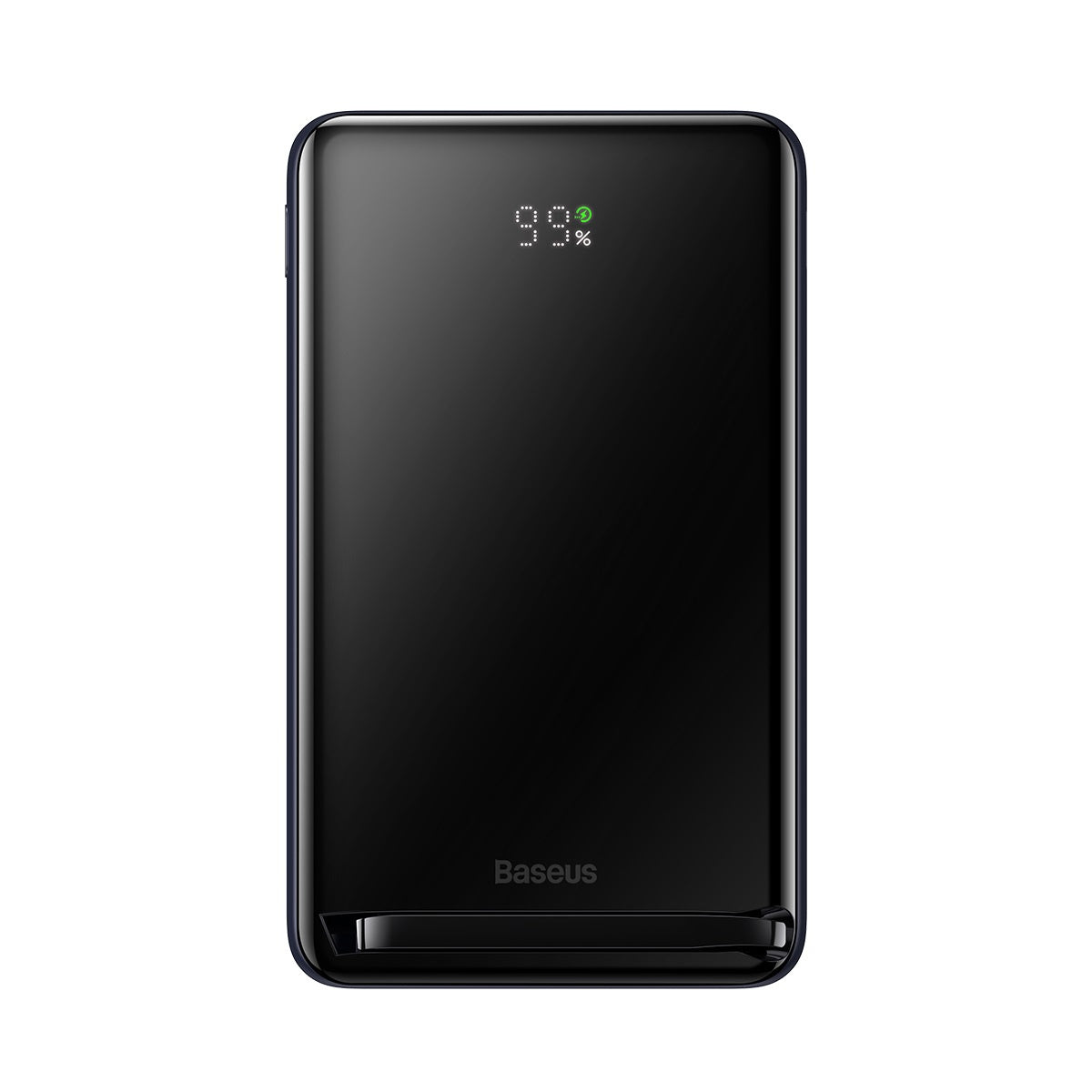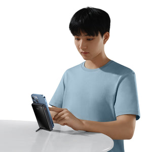 Ārējam akumulatoram ir salokāms statīvs, kas ļauj uzlādēt viedtālruni stāvus.