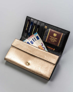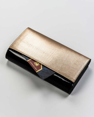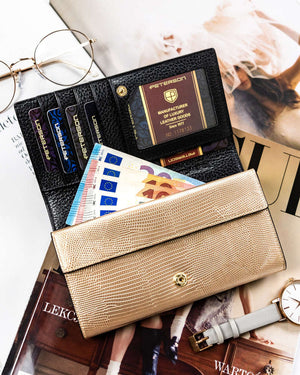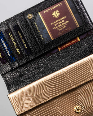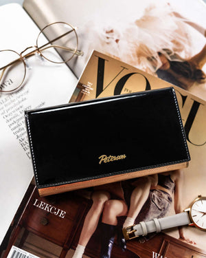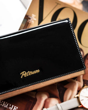 Elegantais melnzelta krāsas lakotas ādas sieviešu maks "Peterson" ir izgatavots no augstas kvalitātes īstas ādas, nodrošinot izturību un stilu.