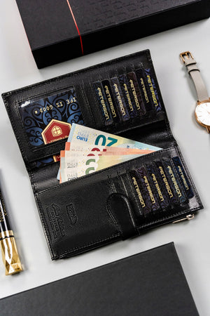 Šis maks ne tikai var saturēt vairāk nekā 15 kartes, bet arī nodrošina papildu drošību ar iebūvētu RFID aizsardzību, lai aizsargātu jūsu datus no neatļautas skenēšanas. Tā lielais izmērs ļauj ērti uzglabāt visas nepieciešamās lietas, un klasiskā melnā krāsa labi piestāv jebkuram stilam.