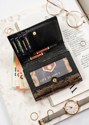 Šis maks ne tikai izskatās lieliski, bet arī droši pasargā jūsu kartes, pateicoties iebūvētajai RFID aizsardzībai . Tā kompaktais izmērs ļauj ērti uzglabāt visas nepieciešamās lietas, un melnā krāsa piešķir daudzpusību un eleganci.