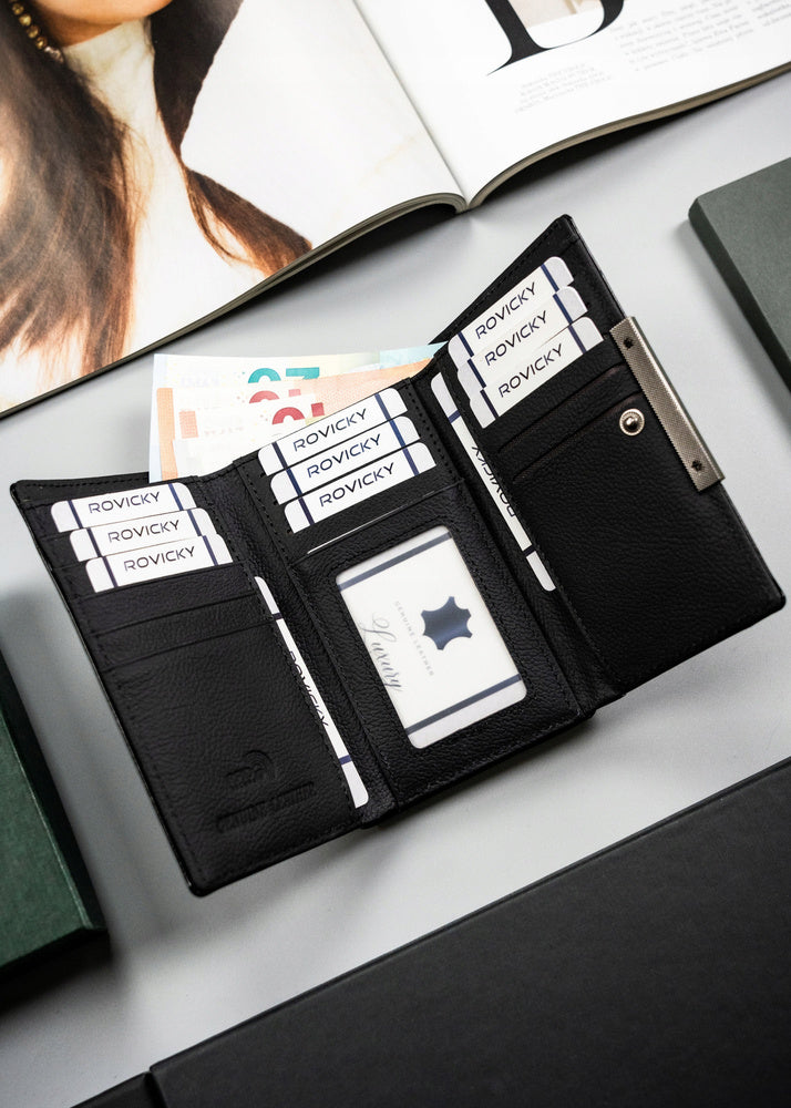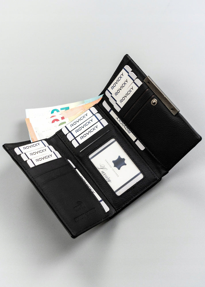 Šis maks ne tikai aizsargā jūsu kartes no nevēlamas skenēšanas, izmantojot RFID tehnoloģiju, bet arī nodrošina pietiekami daudz vietas visām jūsu nepieciešamajām lietām. Tā klasiskā melnā krāsa lieliski piestāvēs jebkuram stilam.