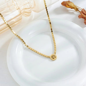 Šī elegantā kaklarota ir izgatavota no ķirurģiskā tērauda, kas pārklāts ar 18 karātu zeltu. Rotaslietas ir hipoalerģiskas un izturīgas pret koroziju. Tās ir lieliski piemērotas gan elegantam, gan ikdienas tērpam.