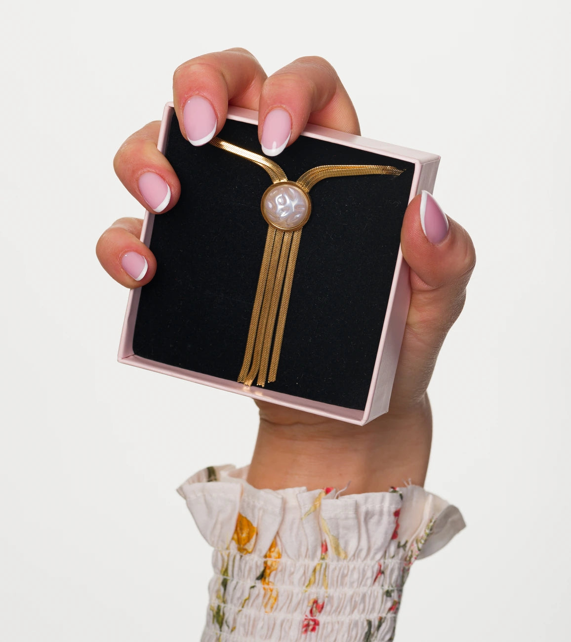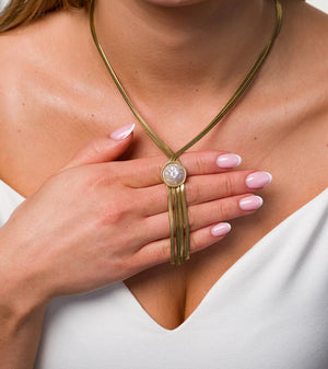Eleganta kaklarota, kas izgatavota no ķirurģiskā tērauda, pārklāta ar 18 karātu zeltu. Šī modernā rotaslieta ir lieliski piemērota gan elegantam, gan ikdienas tērpam. Kaklarota sastāv no divām plānām, plakanām ķēdītēm, kas savienotas ar apaļu rotājumu ar spīdīgu centru.