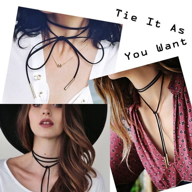Komplektā ietilpst 10 melnas kaklarotas. Garākās ir 150 cm garas, bet pārējo garums ir no 32 līdz 35 cm. Īsākajām kaklarotām ir regulējama ķēdīte ar 5 cm garumu.