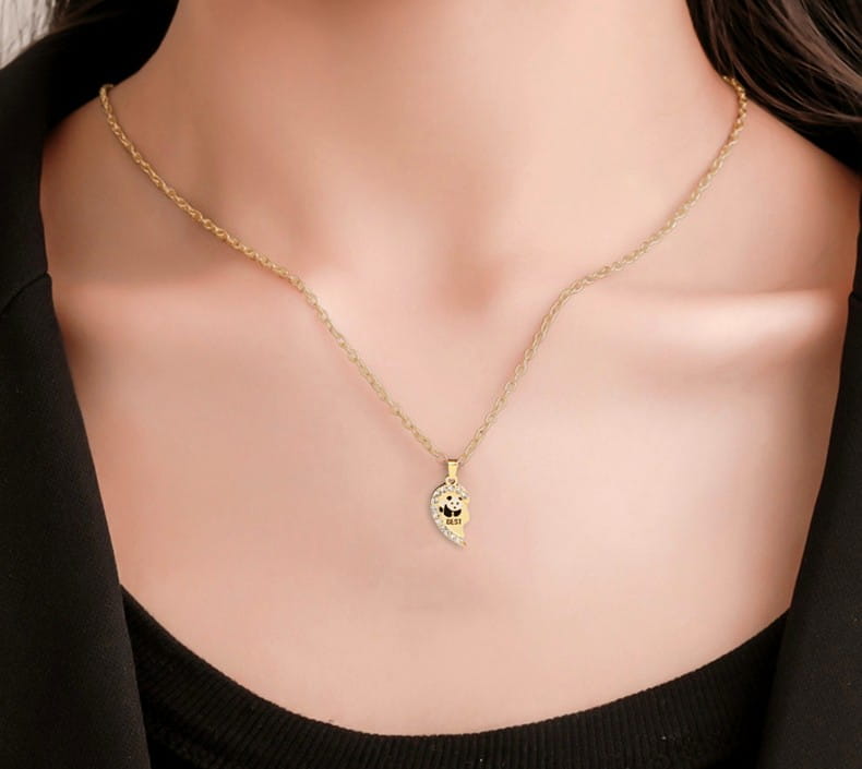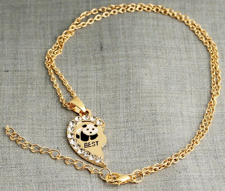 - Kulona dizains: Dekorēts ar cirkoniem, ar iegravētu pandu un uzrakstu "Labākie draugi".