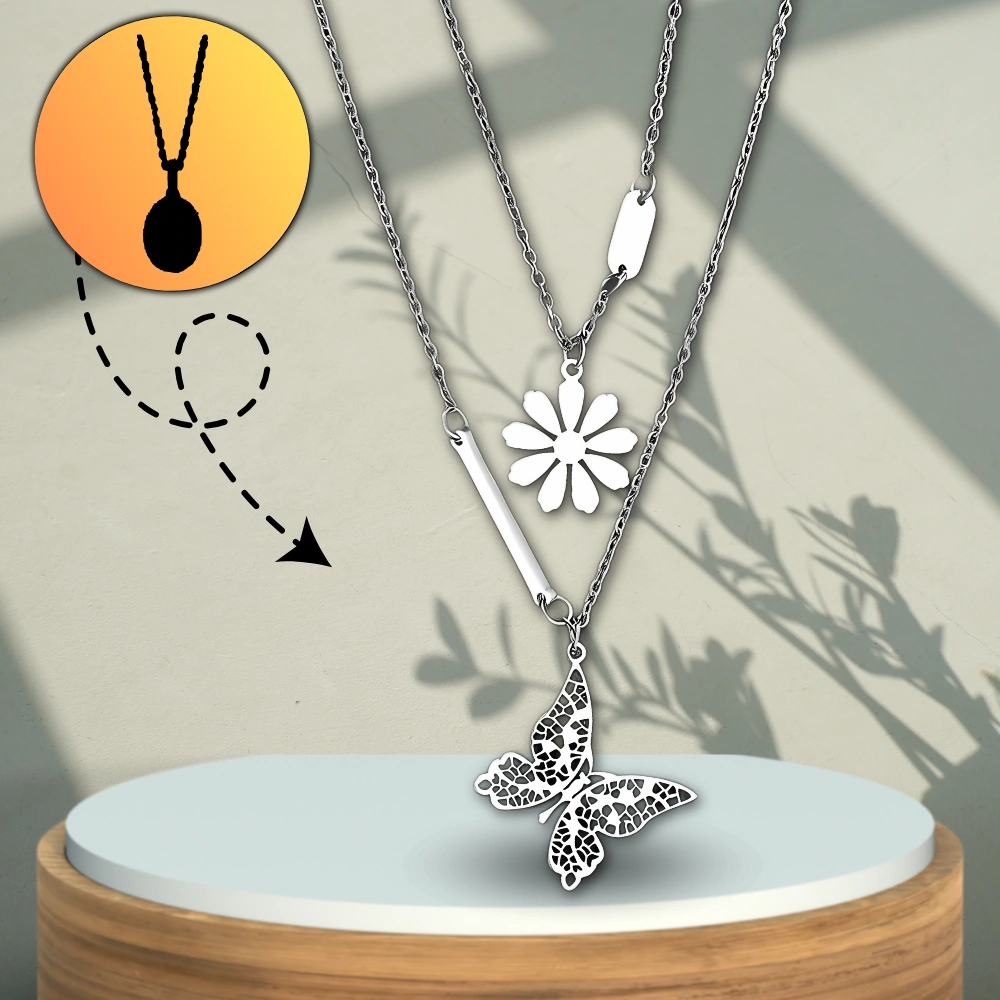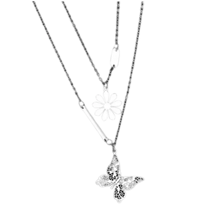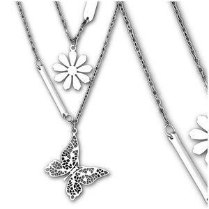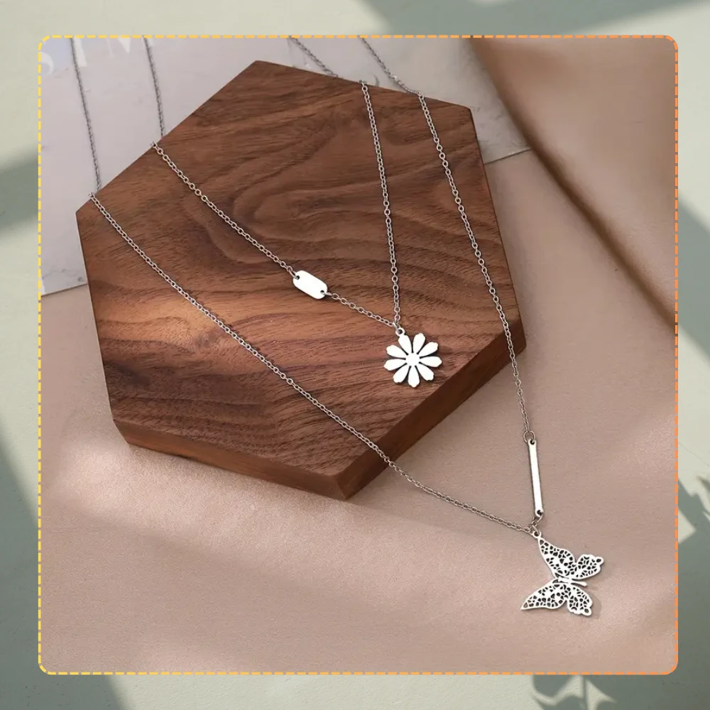Šī kaklarota ir izgatavota no antialerģiska rotaslietu tērauda, nodrošinot komfortu un izturību. Rotaslietas ir dubultas, dekorētas ar smalku tauriņu un ziedu motīvu, piešķirot eleganci un šarmu.