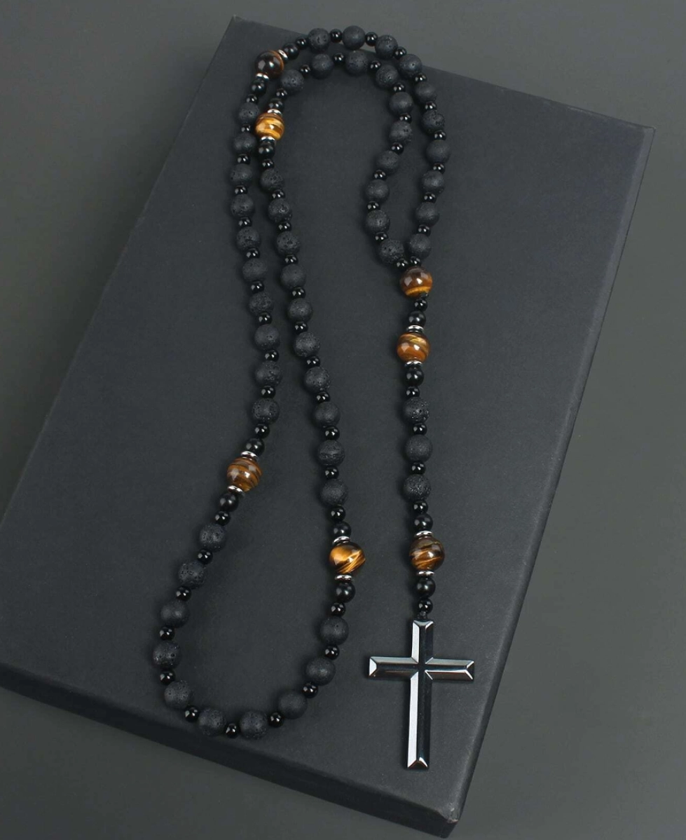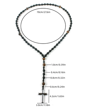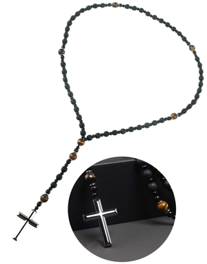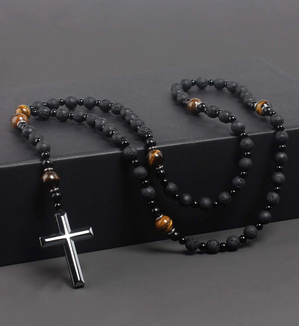 Unikāla melna rožukroņa kaklarota, kas izceļas ar savu eleganci un raksturu.