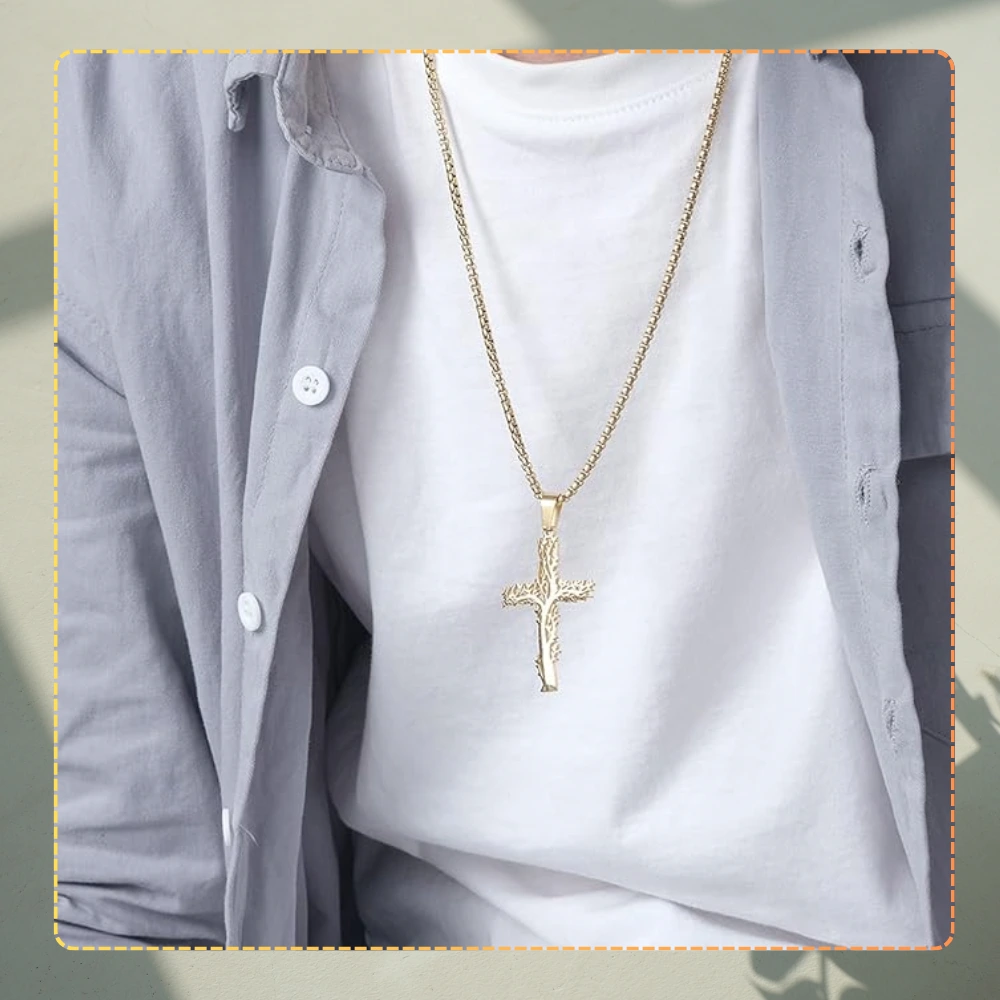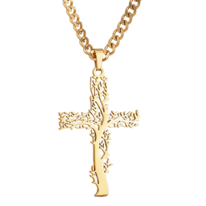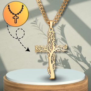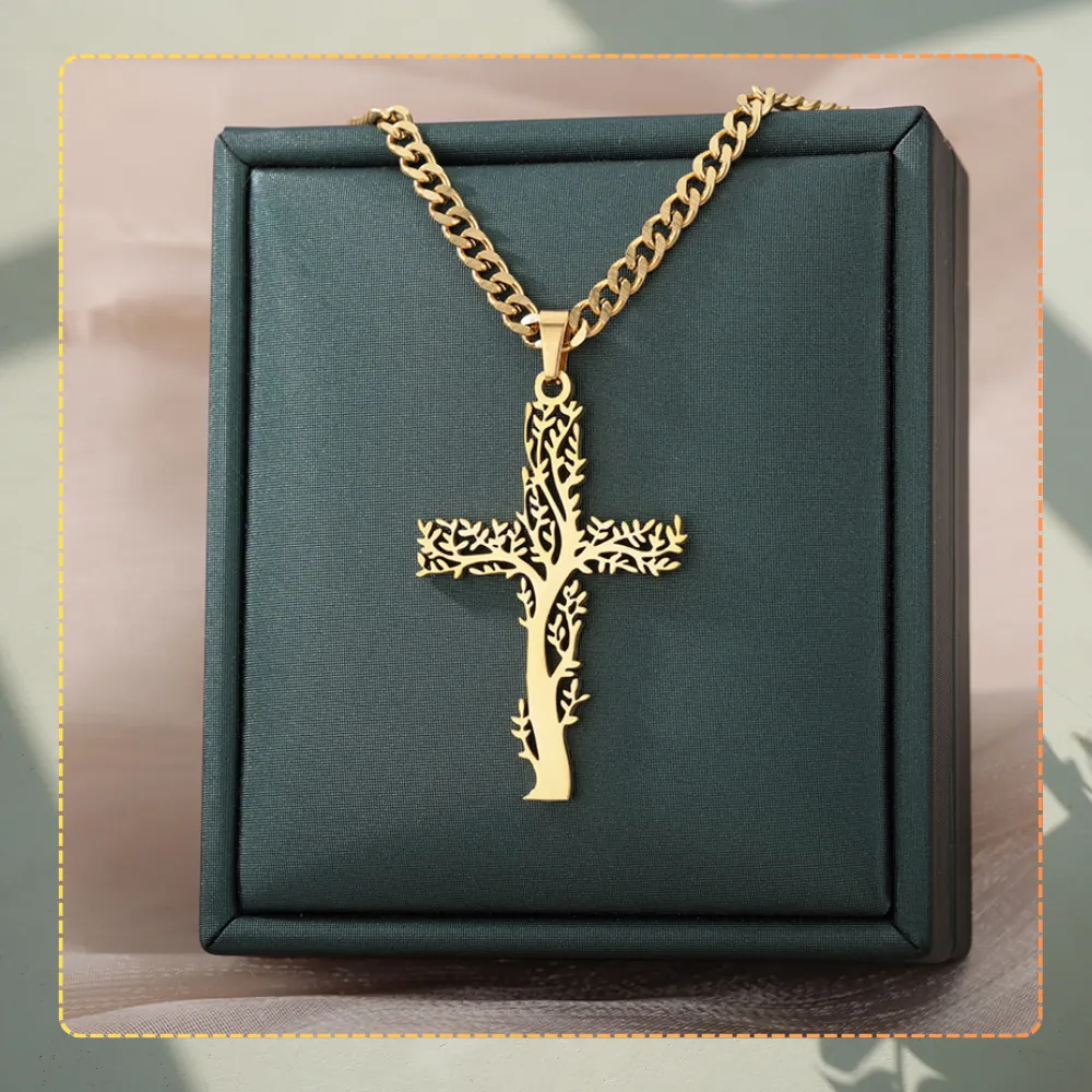 Šī kaklarota ir izgatavota no antialerģiska rotaslietu tērauda, kas nodrošina komfortu un izturību. Zelta ķēdīte ar krusta un dzīvības koka motīvu piešķir unikalitāti un stilu.