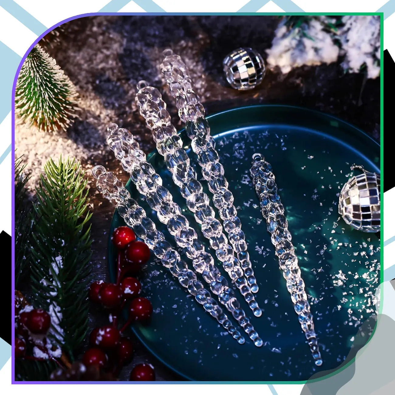 - Krāsa un stils: caurspīdīgi, spīdīgi kadiņi, imitējot dabisko ledu