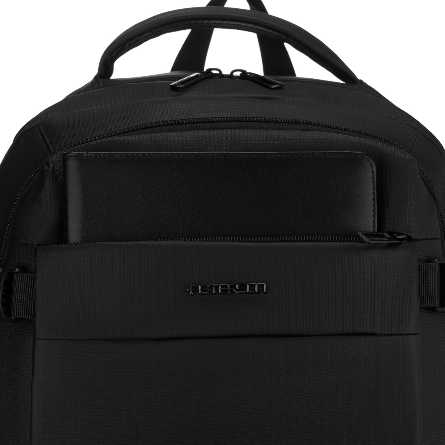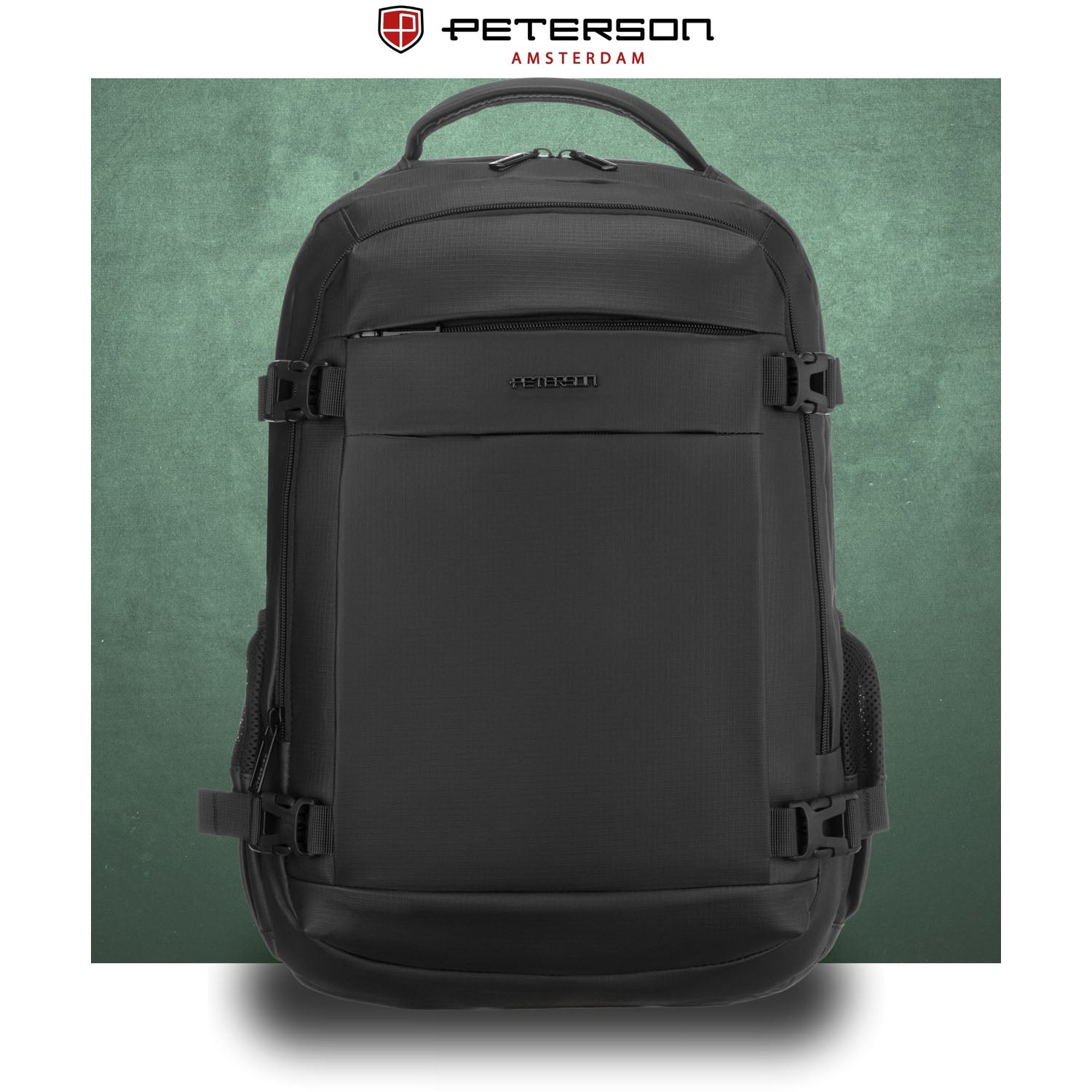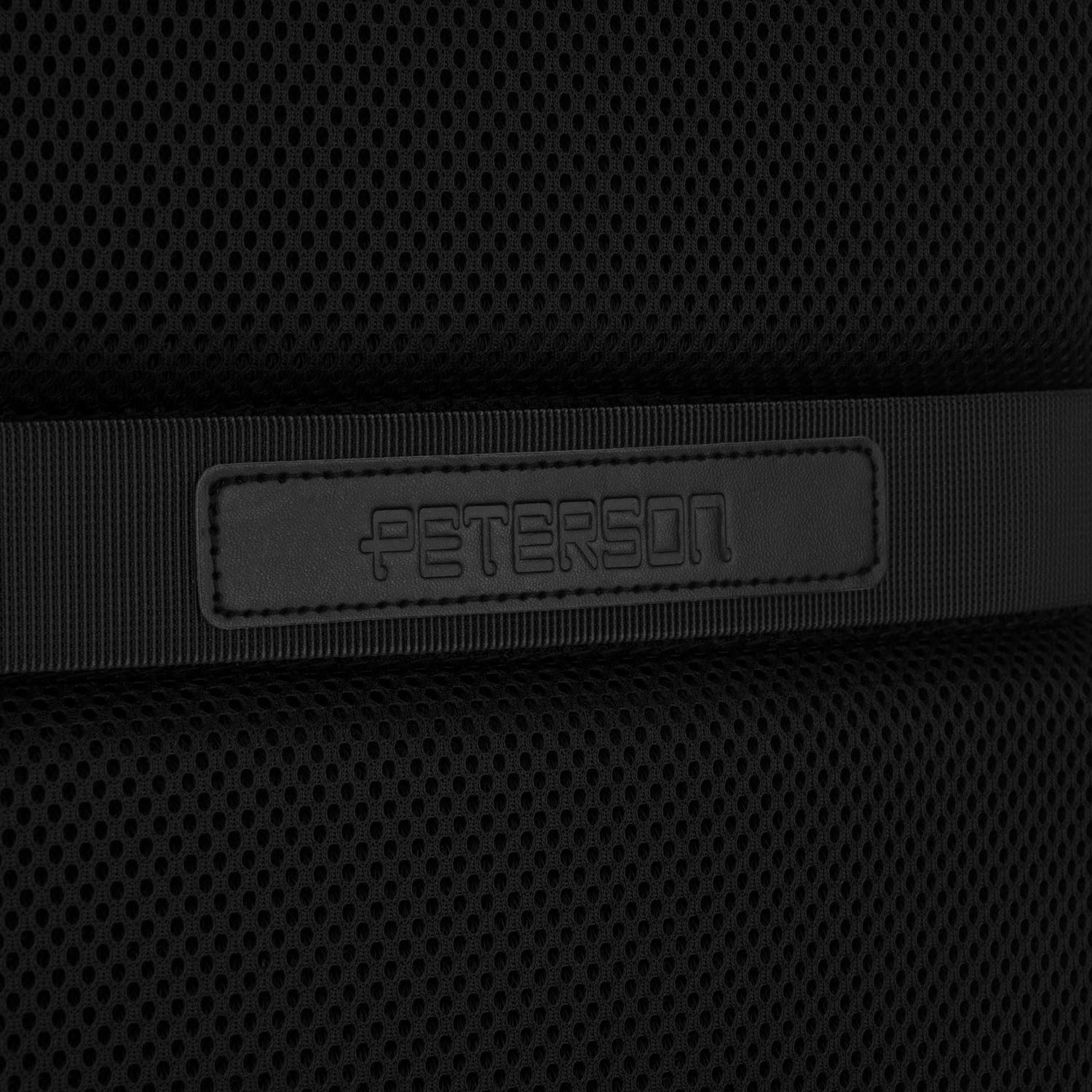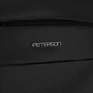 Liela melna Peterson unisex mugursoma, kas izgatavota no augstas kvalitātes mākslīgās ādas, ir praktiska izvēle ikdienas lietošanai un darbam. Ietilpīgais dizains ļauj ērti ievietot A4 formāta dokumentus un klēpjdatoru līdz 17 collu izmēram, padarot mugursomu piemērotu gan pilsētai, gan ceļojumiem vai sportam.