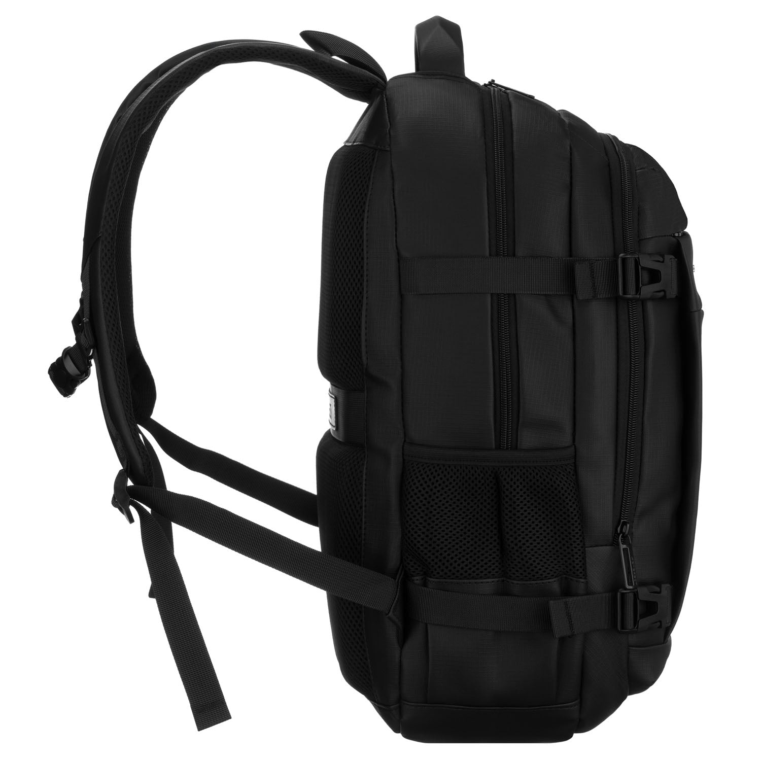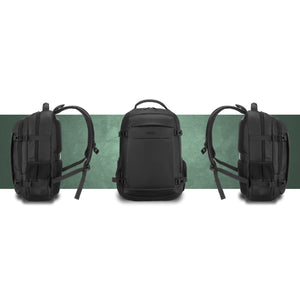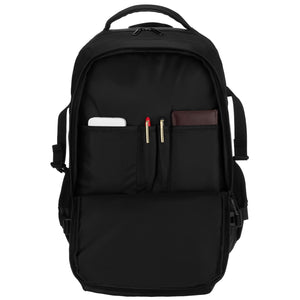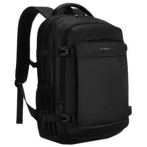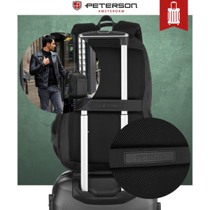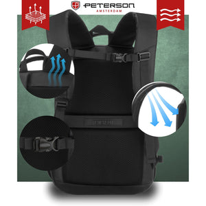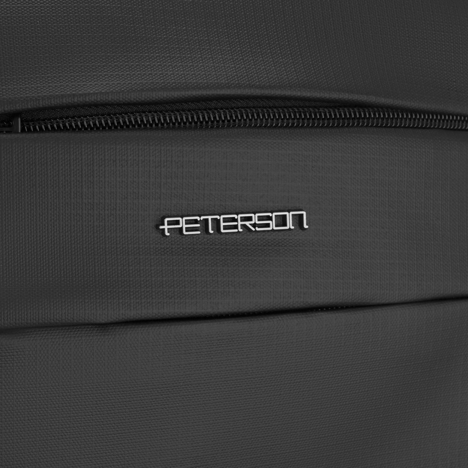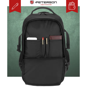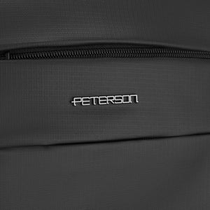 Liela melna Peterson unisex mugursoma, kas izgatavota no augstas kvalitātes mākslīgās ādas, ir praktiska izvēle ikdienas lietošanai un darbam. Ietilpīgais dizains ļauj ērti ievietot A4 formāta dokumentus un klēpjdatoru līdz 17 collu izmēram, padarot mugursomu piemērotu gan pilsētai, gan ceļojumiem vai sportam.