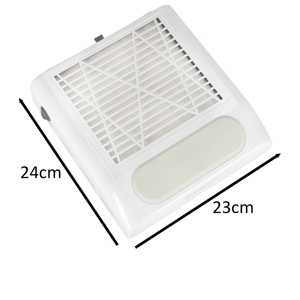 Neaizstājams palīgs katrā skaistumkopšanas salonā ir putekļu savācējs. Pateicoties 80 W jaudai un 4500 apgr./min ventilatora ātrumam, tas efektīvi noņem putekļus, kas rodas nagu vīlēšanas laikā, nodrošinot tīru darba vietu un komfortu procedūru laikā. Bezmaisa sistēma ar kasešu filtru atvieglo tīrīšanu un novērš putekļu izkļūšanu no ierīces. Ergonomiskā forma un spilvens nodrošina ērtu rokas pozīciju salona klientiem. Ierīce darbojas no elektrotīkla (strāvas adapteris ir iekļauts komplektā).