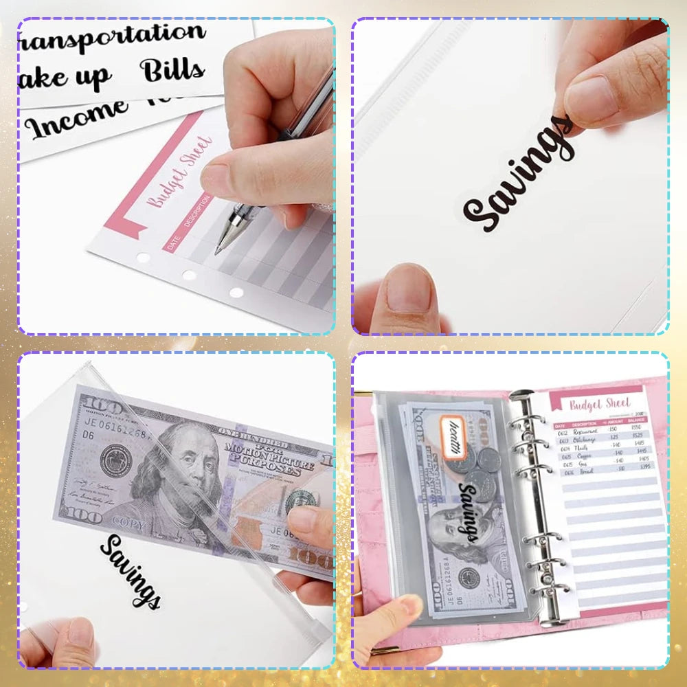 - Komplektā ietilpst: 12 caurspīdīgas aploksnes naudai, 12 krāsainas budžeta kartītes, 2 uzlīmes ar piezīmēm, 24 krāsainas taisnstūrveida uzlīmes.