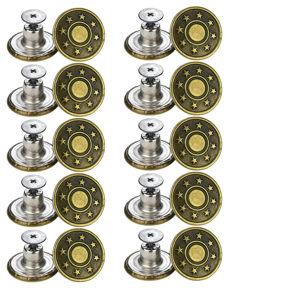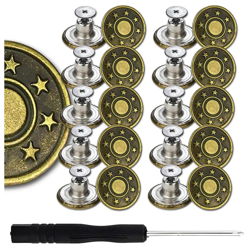 - **Produkta veids un mērķis**: Galda pogu komplekts ar skrūvgriezi džinsiem, biksēm, jakām un citam apģērbam.