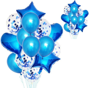 Šis 14 balonu komplekts ar zilu krāsu ir lieliski piemērots elegantu dekorāciju veidošanai. Komplektā ietilpst trīs dažādu veidu baloni: spīdīgi, folijas un caurspīdīgi ar konfeti iekšpusē.