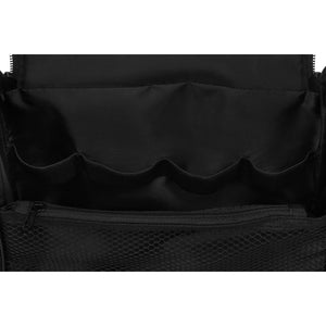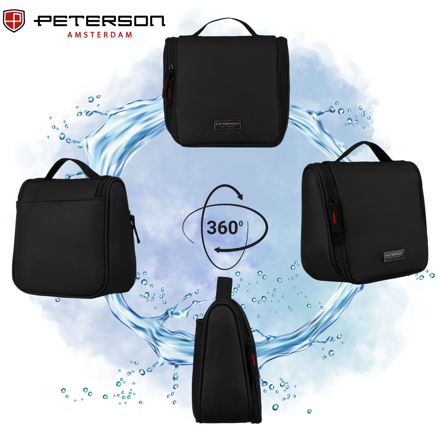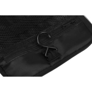 Ceļojumu kosmētikas somiņa ar āķi, melna, sintētiska, ir praktiska un stilīga izvēle vīriešiem, kas meklē ērtu veidu, kā uzglabāt savas personīgās mantas ceļojuma laikā.