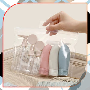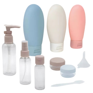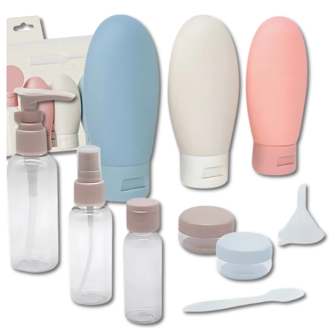 Šis 11 daļu silikona pudeļu komplekts ir ideāls ceļojumu risinājums kosmētikas un tualetes piederumu ērtai glabāšanai.
