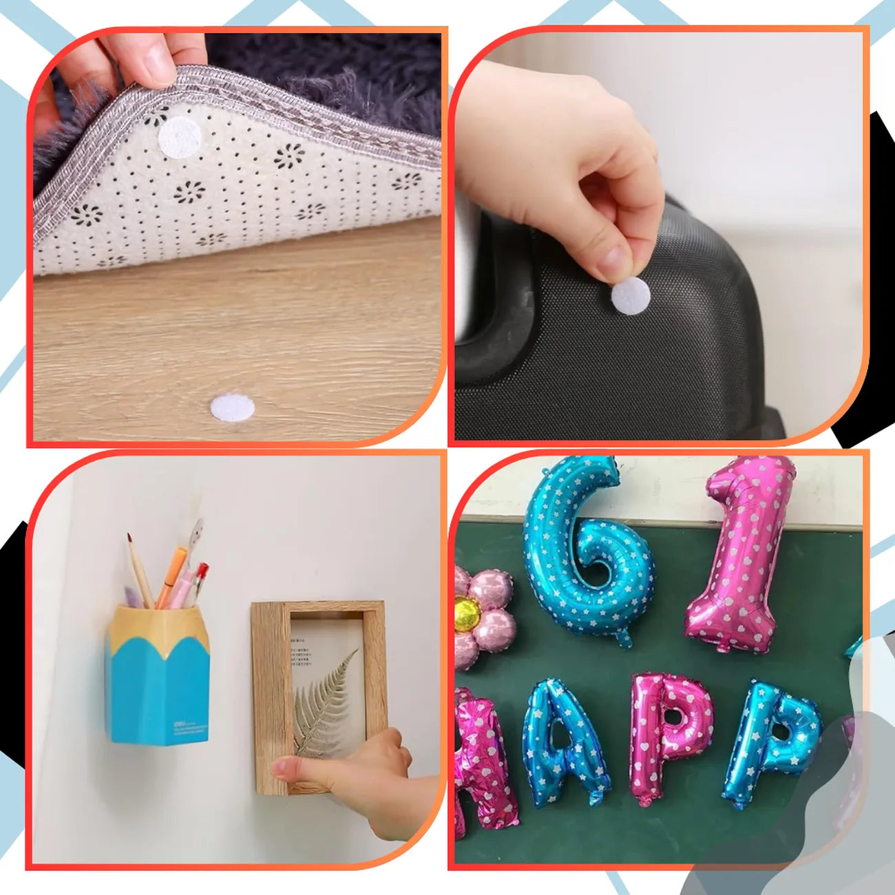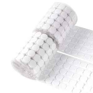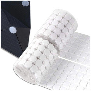 Komplektā ietilpst: 600 gab. (300 pāri) apaļu līmlentu ar diametru 20 mm - 300 gab. āķu (raupjā puse) un cilpu (mīkstā puse).