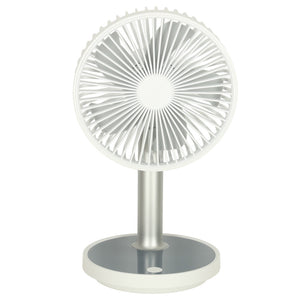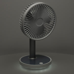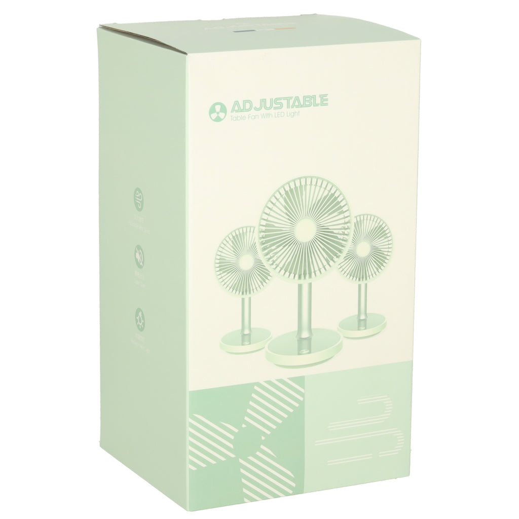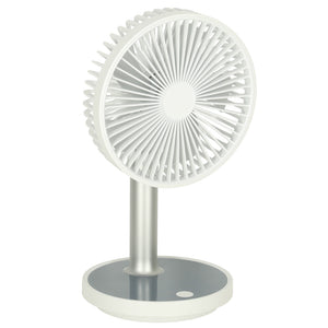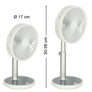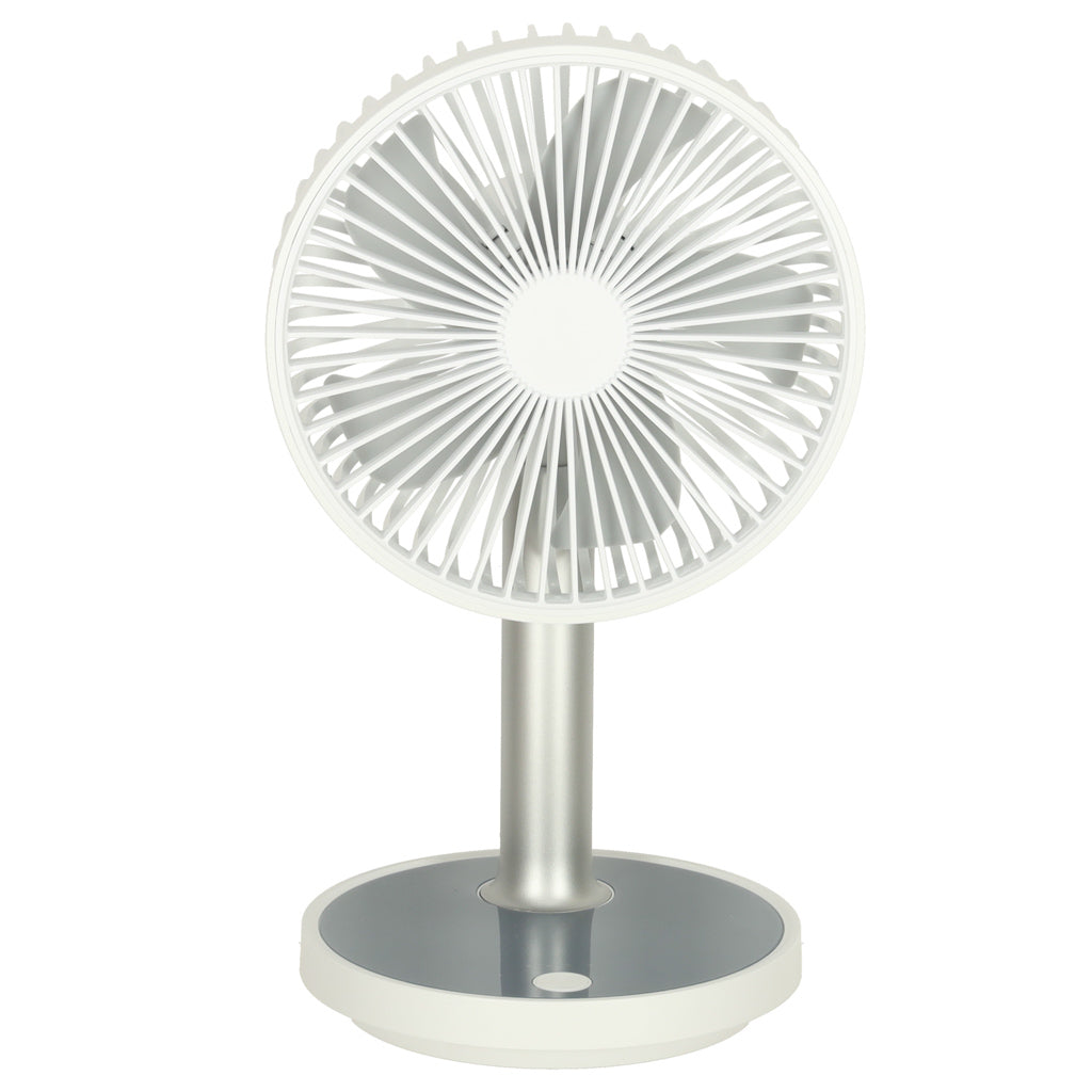 Mūsdienīgs galda ventilators , kas apvieno stilu, funkcionalitāti un ērtības. Tam ir četri darbības režīmi , kas ļauj pielāgot gaisa plūsmu jūsu personīgajām vajadzībām. Turklāt tam ir pamatnes apgaismojuma funkcija , kas būs īpaši noderīga naktī. Ventilatora augstumu (30–38 cm) var regulēt atbilstoši personīgajām vēlmēm. Tā elegantā, baltā apdare lieliski iederas jebkurā interjerā, un kompaktie izmēri ļauj to viegli pārvietot. Lieliska izvēle tiem, kas meklē efektīvu risinājumu karstām dienām birojā vai mājās. To var uzlādēt, izmantojot komplektā iekļauto USB kabeli. Pilnībā uzlādēts akumulators nodrošina līdz pat 7 stundām nepārtrauktas darbības (atkarībā no izvēlētā režīma).