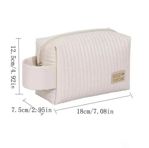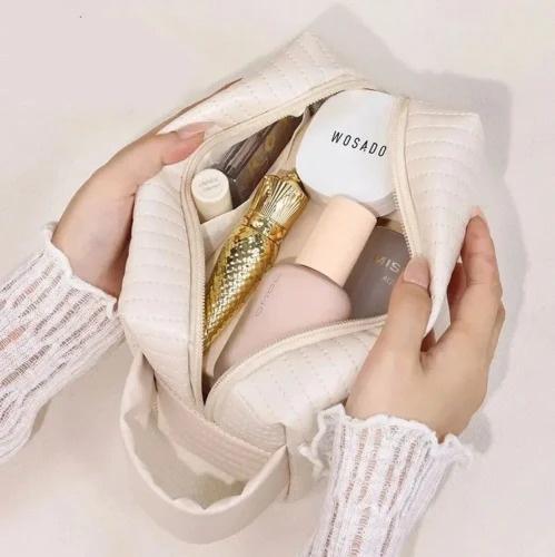 Šī elegantā bēšā kosmētikas somiņa ir izgatavota no organiskas ādas un ir lieliski piemērota gan ikdienas lietošanai, gan ceļojumiem.