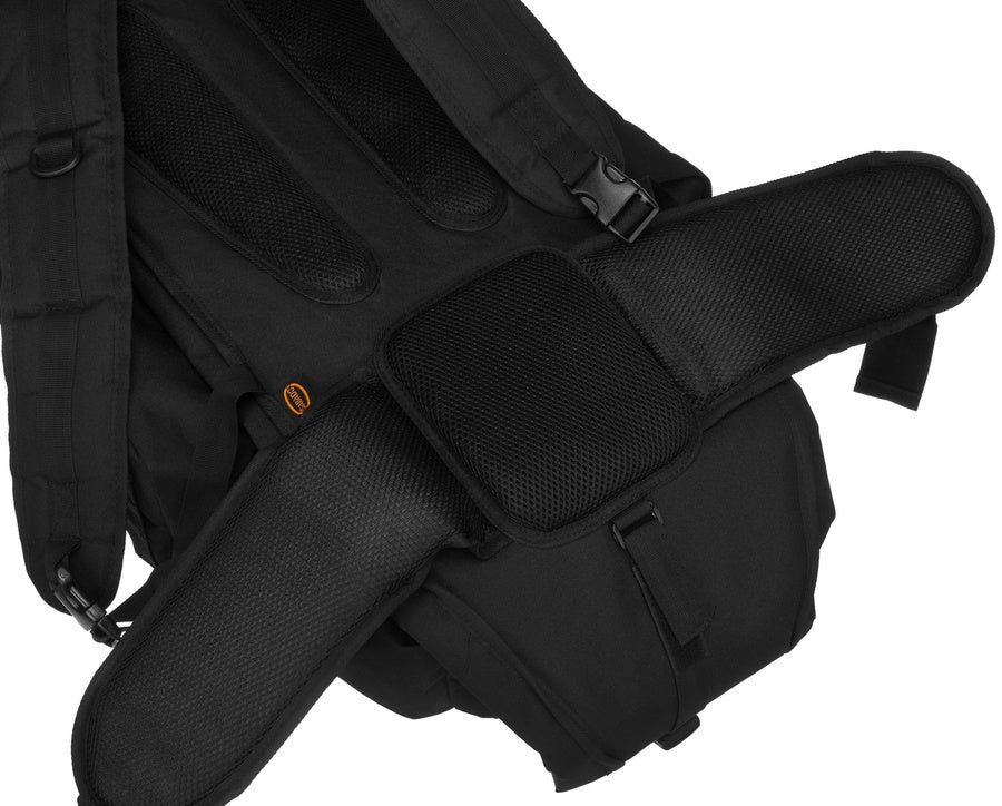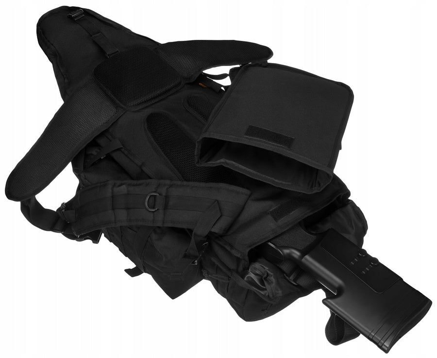 - Regulējamas plecu siksnas ar vertikālām stiprinājuma siksnām un D gredzenu papildu aprīkojumam