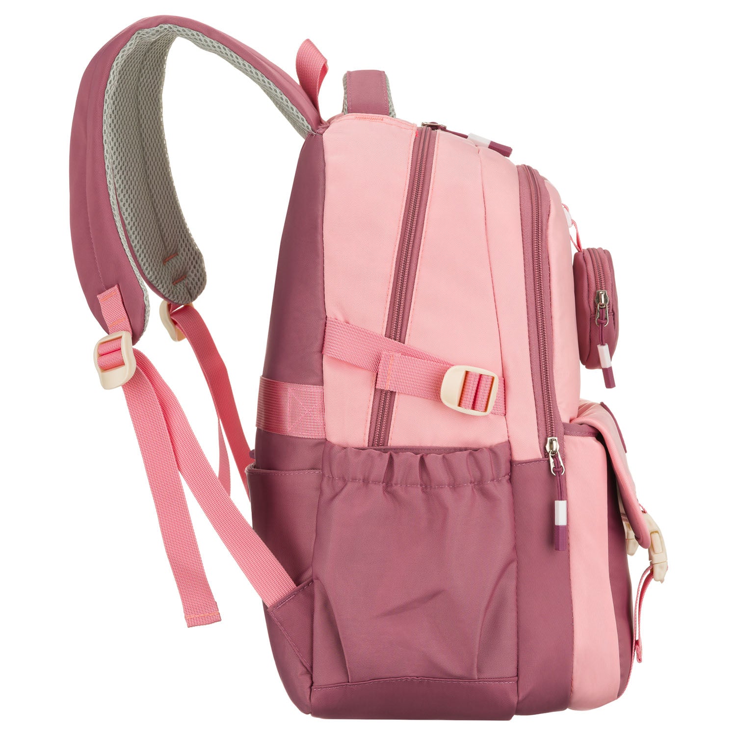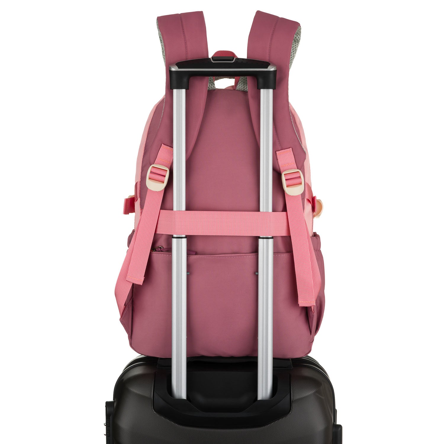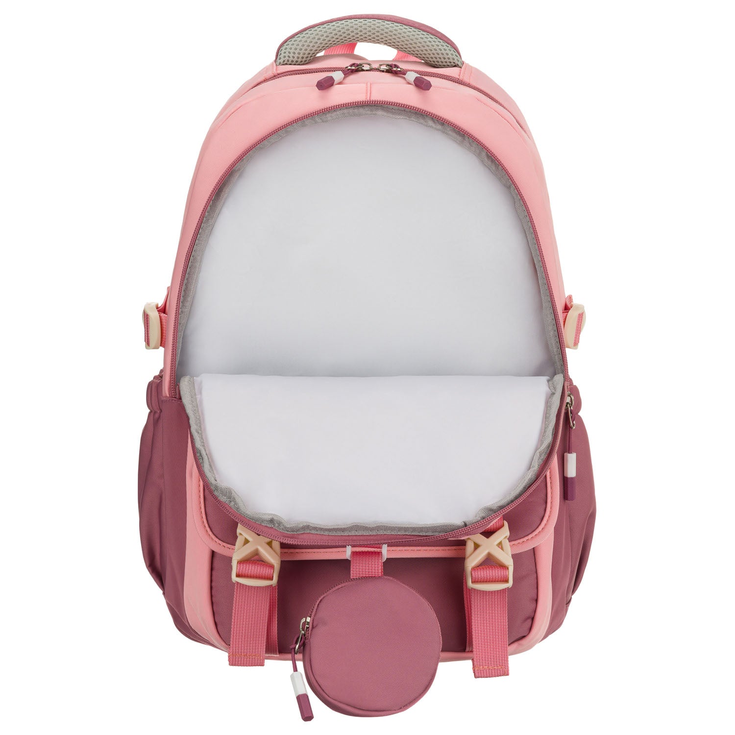 Peterson rozā liela poliestera mugursoma ar diviem nodalījumiem un piecām kabatām, kas lieliski piemērota ikdienas lietošanai.