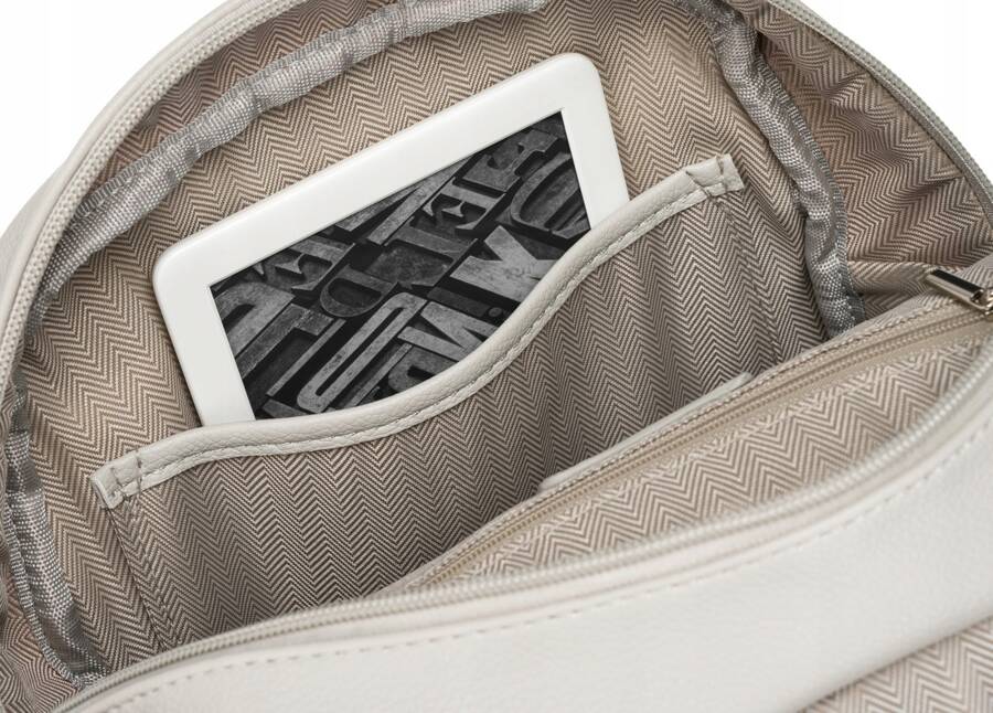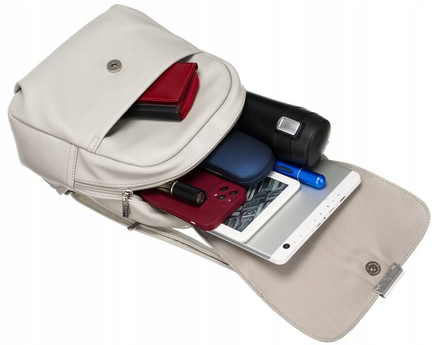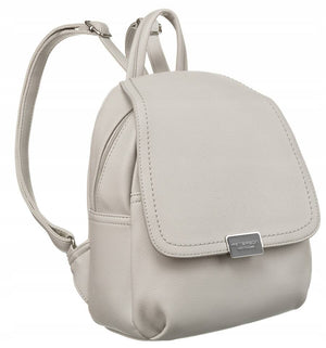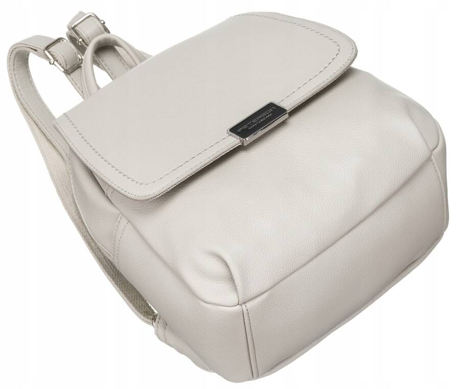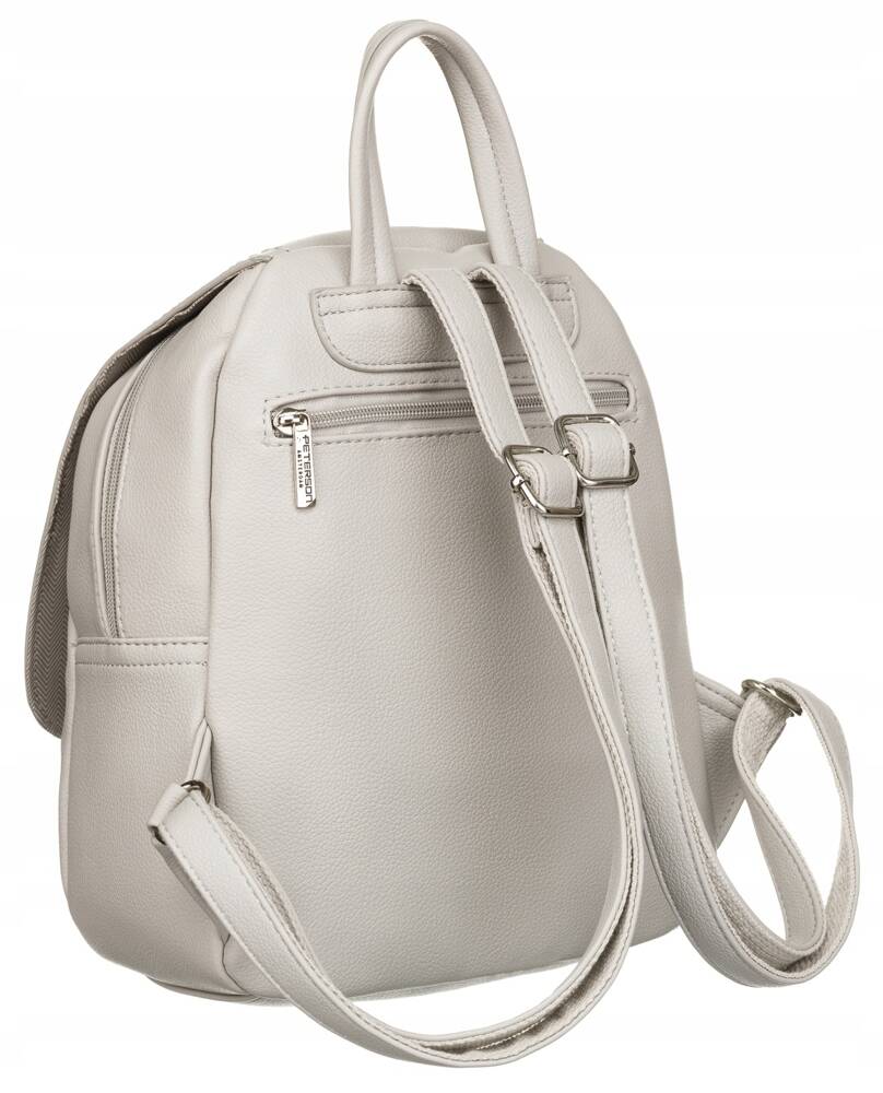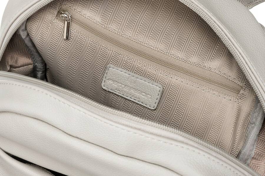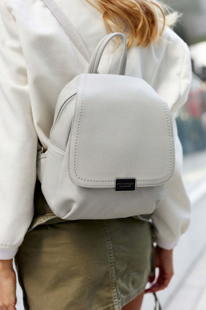 Peterson pelēka sieviešu mugursoma, kas izgatavota no mākslīgās ādas, ir stilīga izvēle ikdienas lietošanai.