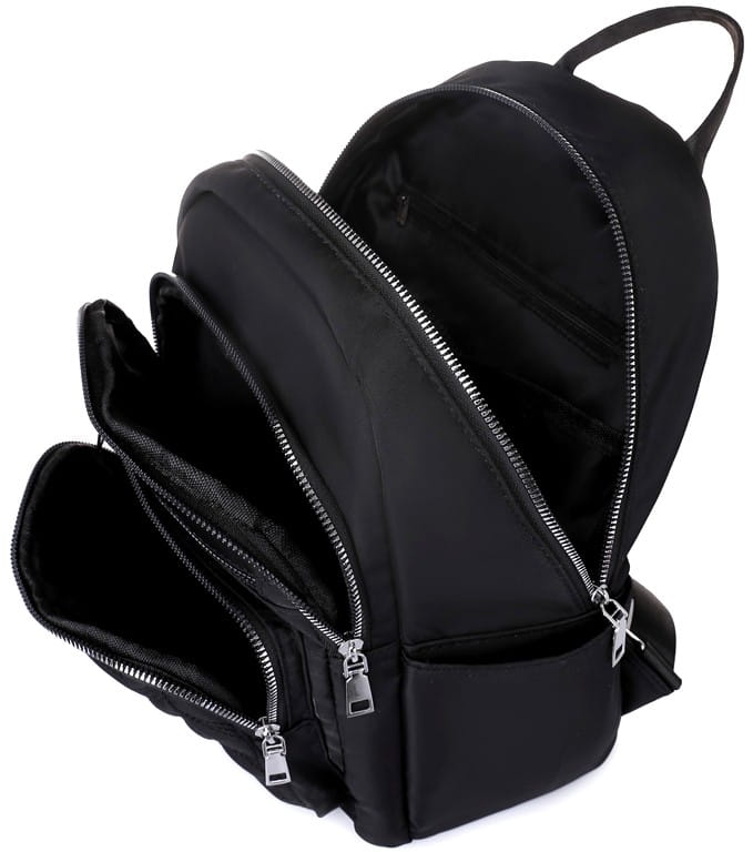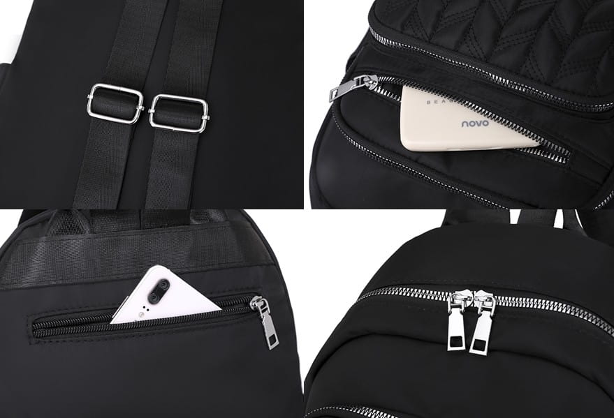Mugursomu var nēsāt uz muguras vai pār plecu. Tai ir divas sānu kabatas un četras ārējās kabatas ar rāvējslēdzējiem. Galvenais nodalījums arī aizveras ar rāvējslēdzēju, un aizmugurē ir papildu kabata ar rāvējslēdzēju. Iekšpusē atradīsiet vienu kabatu ar rāvējslēdzēju.