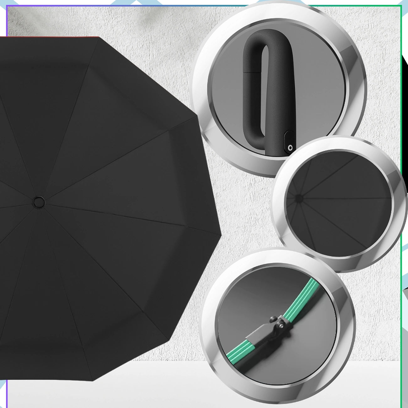 Lietussarga konstrukcija ir īpaši izturīga – 10 tērauda stieņi un elastīgi rāmja elementi efektīvi aizsargā pret vēju un kupola apgriešanos. Modernie zaļie stieņi piešķir lietussargam mūsdienīgu, elegantu izskatu, piemērotu jebkurai situācijai – ceļojot uz darbu, universitāti vai pastaigā. Komplektā ietilpst viegla soma, kas atvieglo lietussarga nēsāšanu un uzglabāšanu. Pateicoties kompaktajiem izmēriem salocītā veidā, tas viegli ietilpst somā, mugursomā vai automašīnas cimdu nodalījumā.