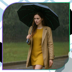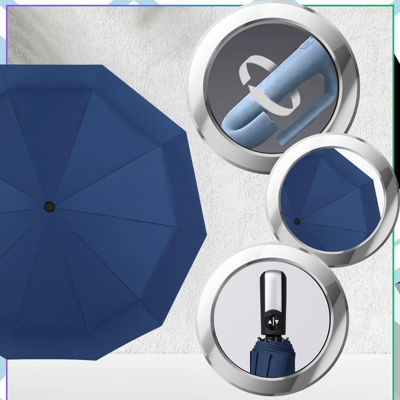 Elegants tumši zils lietussargs ar zaļiem akcentiem. Lietussargam ir izturīga konstrukcija ar dubultiem stieņiem, kas nodrošina aizsardzību pret vēju. Aprīkots ar ērtu plastmasas rokturi ar karabīni un automātiskās atvēršanas un aizvēršanas pogu. Lietussargs lieliski aizsargā pret lietu un sauli, jo ir izgatavots no ūdensizturīga materiāla, kas bloķē UV starus.
