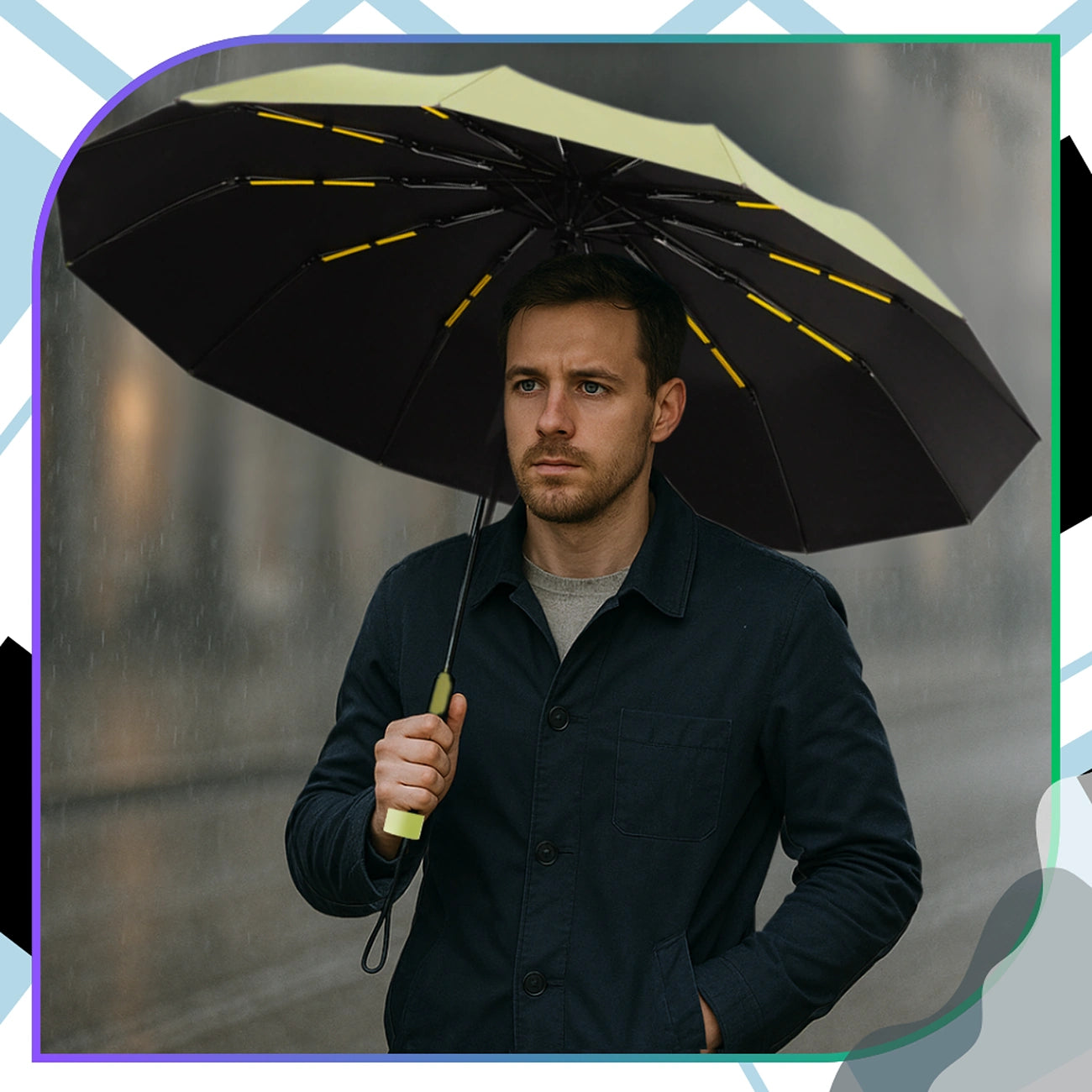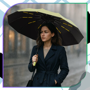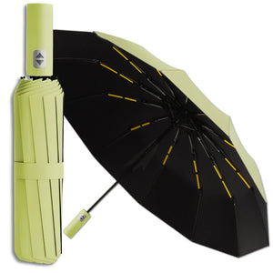 Nekādu kompromisu starp stilu, izturību un funkcionalitāti – šis jaunais automātiskais lietussargs ar zaļu ārpusi, melnu iekšpusi un oranžiem akcentiem ir lieliski piemērots jebkuriem laikapstākļiem. Konstrukcija ar dubultajiem stieņiem nodrošina maksimālu stabilitāti pat stiprā vēja laikā. 12 stieņi veido plašu, stabilu kupolu ar 105 cm diametru, efektīvi aizsargājot vienu vai divas personas. Hidrofobisks audums ne tikai atgrūž ūdeni, bet arī bloķē UV starus, padarot lietussargu piemērotu arī kā saules aizsargu. Ergonomisks rokturis un automātiskās pogas funkcija ļauj viegli un ātri atvērt vai salocīt lietussargu. Salocīts garums ir tikai 28 cm, tāpēc tas ērti ievietojams somā, mugursomā vai portfelī.