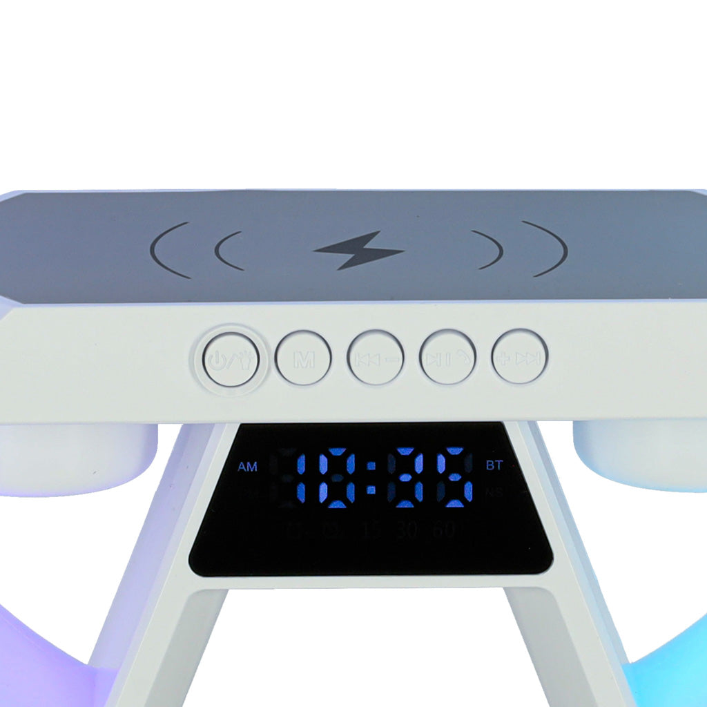 Lampa ar indukcijas lādētāju ir daudzfunkcionāla ierīce, kas ir lieliski piemērota ikdienas lietošanai. Tā piedāvā 15 W bezvadu uzlādi , RGB lampu, integrētu skaļruni, modinātāju un radio. Ierīce atbalsta SD kartes un Bluetooth, ļaujot bezvadu režīmā atskaņot mūziku. Lampai ir moderns balts dizains , kas iederas dažādos interjeros. Praktiskas pogas uz korpusa ļauj ērti kontrolēt funkcijas. Ir iebūvēts 3,7 V 500 mAh akumulators , bet bezvadu uzlāde ir iespējama tikai tad, kad ierīce ir pievienota strāvas avotam.
